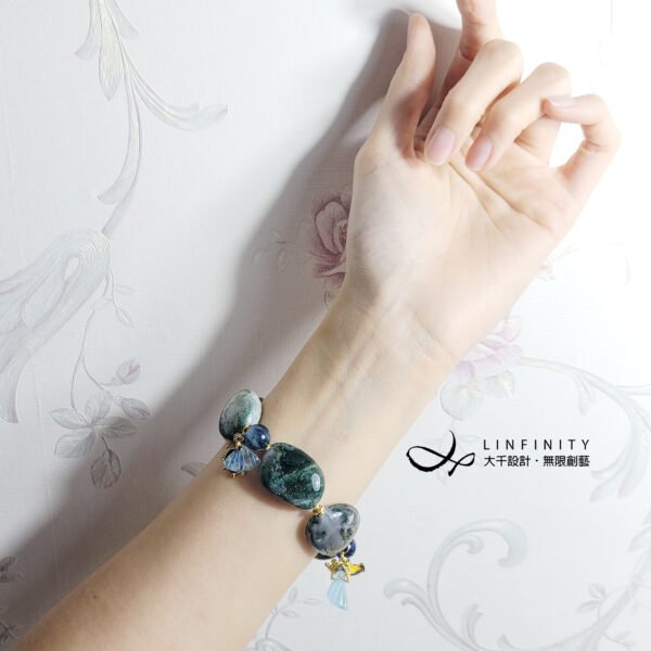 材質:天然水草瑪瑙(玉瓍)、藍幽靈水晶、海藍寶、琺瑯、18K金、925銀