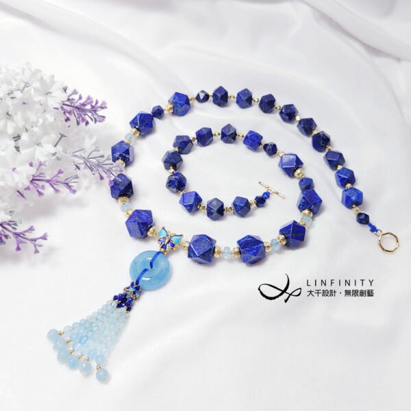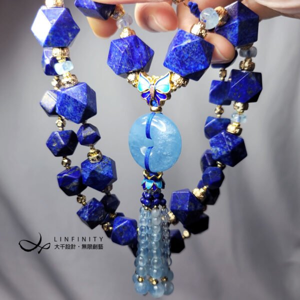嚴選頂級海藍寶,精工磨製平安扣(古錢,招財),相佐歷代帝王祭天禮石-帝王青青金石、富貴吉祥琺瑯蝴蝶(福氣)設計。