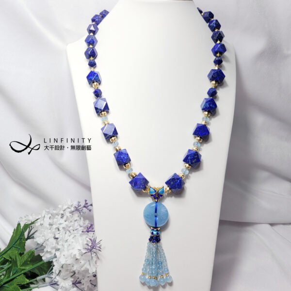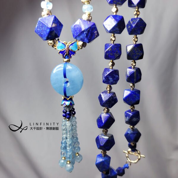 1.圖上海藍寶平安扣高約24.5mm,流蘇(琺瑯蝴蝶+平安扣+琺瑯蓮花+海藍寶珠)長約10cm,鍊身大切面青金石14mm、小切面青金石7.4mm,項鍊(不含流蘇墜)總長度約62cm