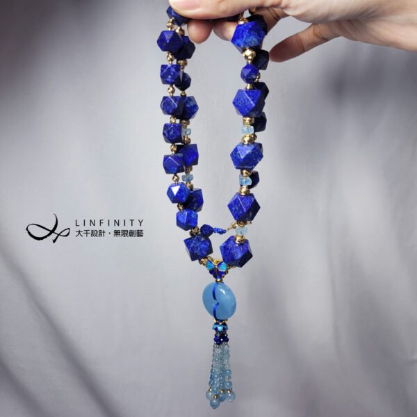 鍊身青金石寶石碩大霸氣,色正而艷,整體演繹富貴、智慧之相。