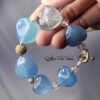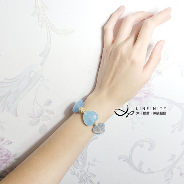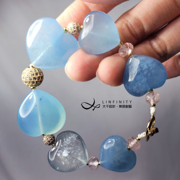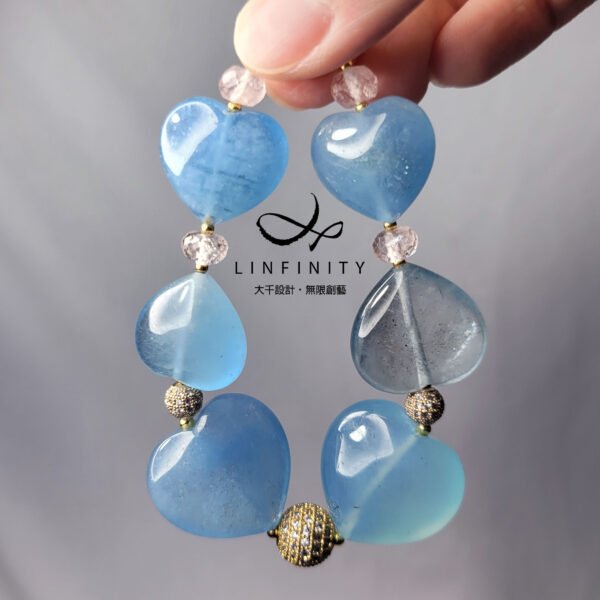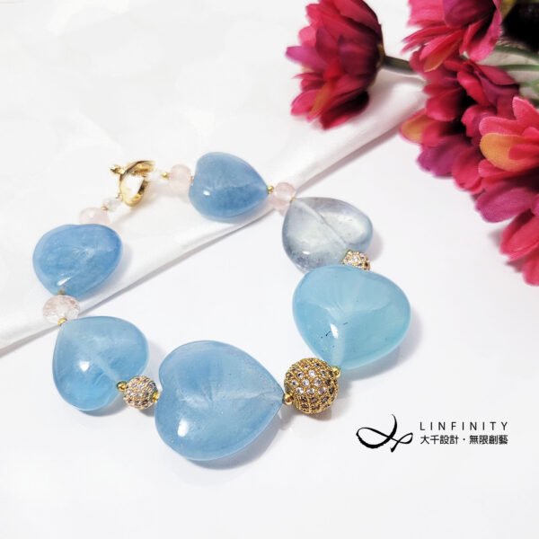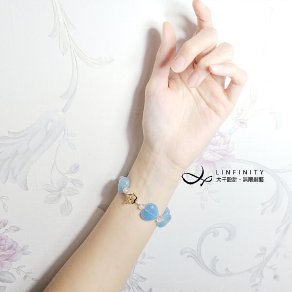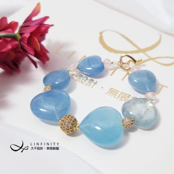 嚴選勇敢者之石-海藍寶(濃郁藍、冰透藍),磨製圓潤心型(心想事成、心心相映)珠飾,設計為蝴蝶結(領結)鍊身,象徵節節高升、高風亮節。