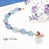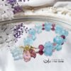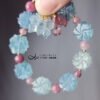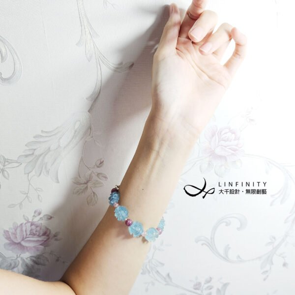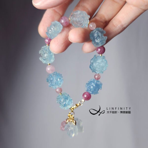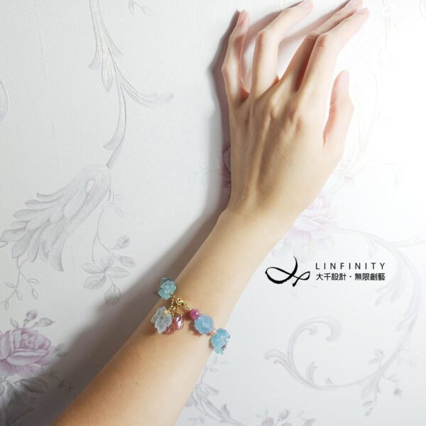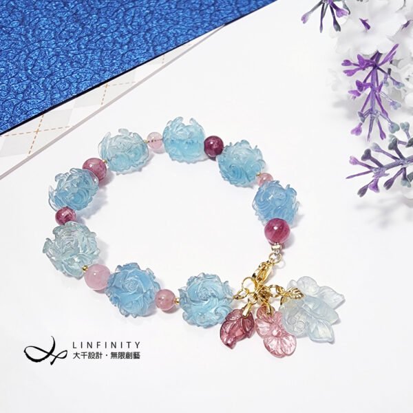 呼應海藍寶的沁藍,以紅粉碧璽(紅運當頭)、梅花碧璽韻律點綴鍊身,整體靈動美麗,碧璽葉(一葉成功、一葉致富)、花(花開富貴)寓意佳,碧璽色彩濃艷、透水、火彩強,整體藍、紅、紫掩映,富貴美麗。