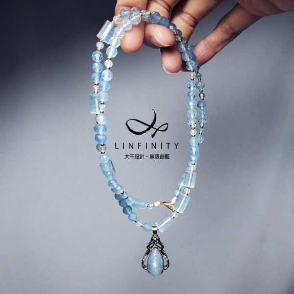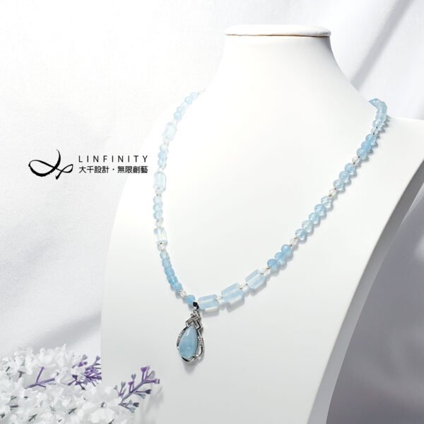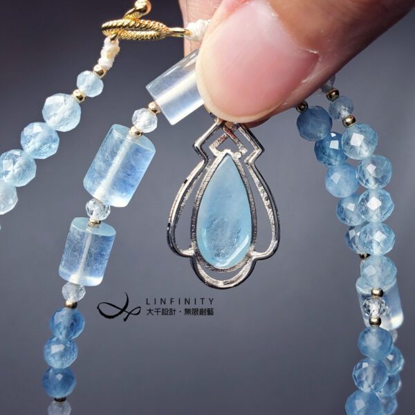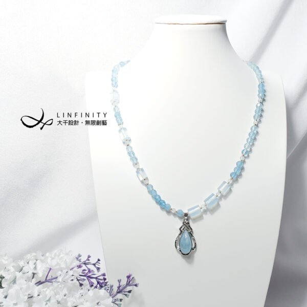 嚴選色彩濃郁、清透、彩虹光兼具之海藍寶水滴墜、圓珠、鑽面珠飾,設計不對稱優雅鍊身,主墜海藍寶水滴以銀鑲製古典窗花暨花苞型,特顯高貴古典。