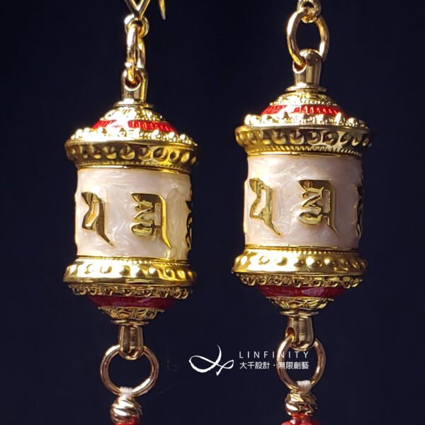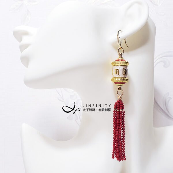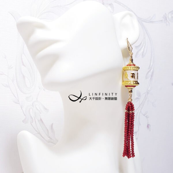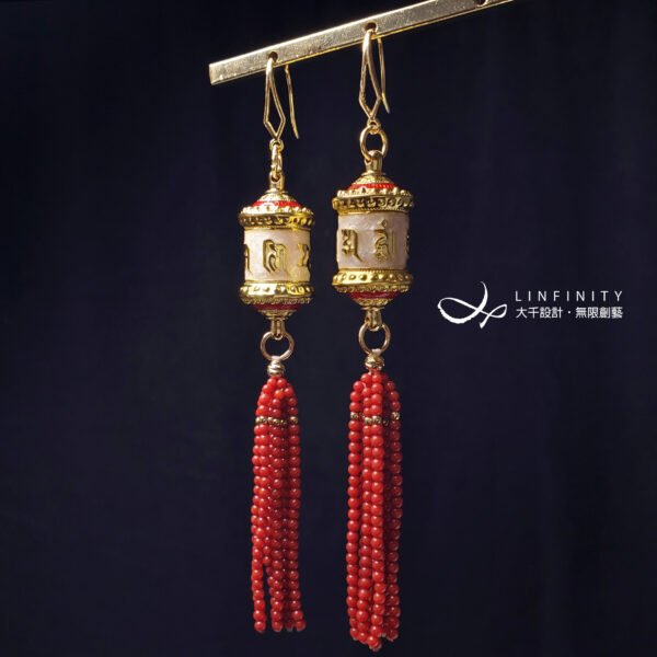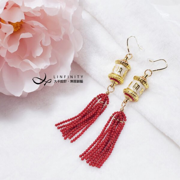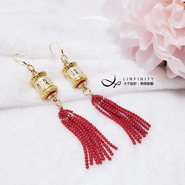 尺寸:轉經輪高約35mm、寬約16mm,珊瑚流蘇高約55.5mm,總體含耳鈎高約11.5cm,可改夾式。
