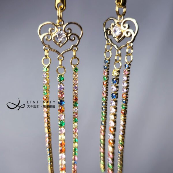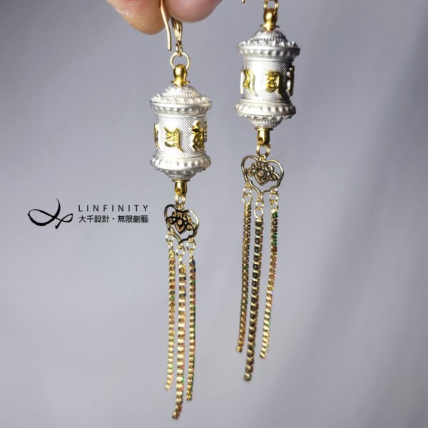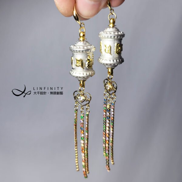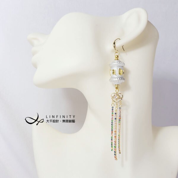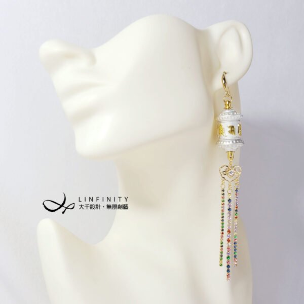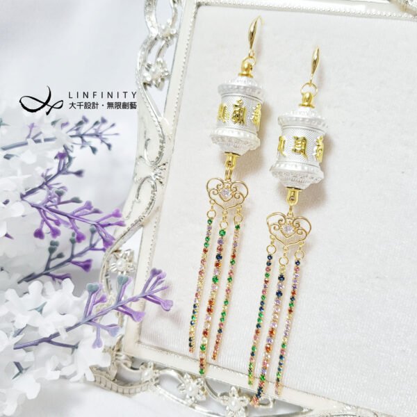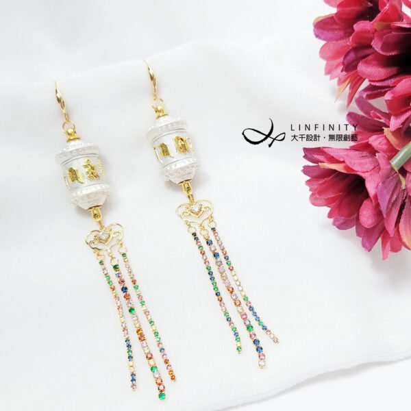 尺寸:轉經輪高約35mm、寬約16mm,彩色鋯石流蘇高約55mm,總體含耳鈎高約12.5cm,可改夾式。