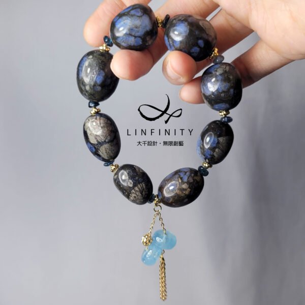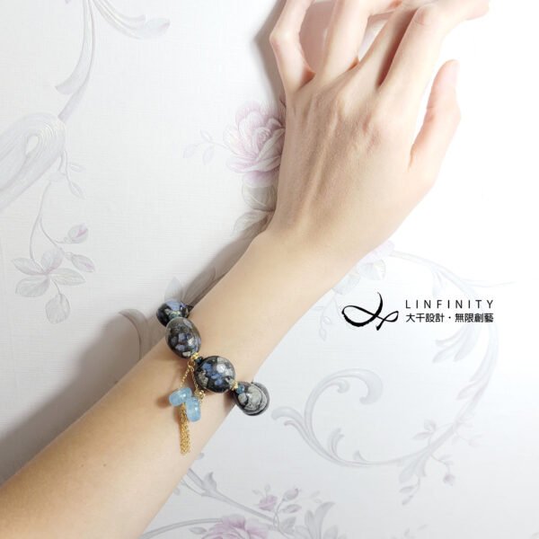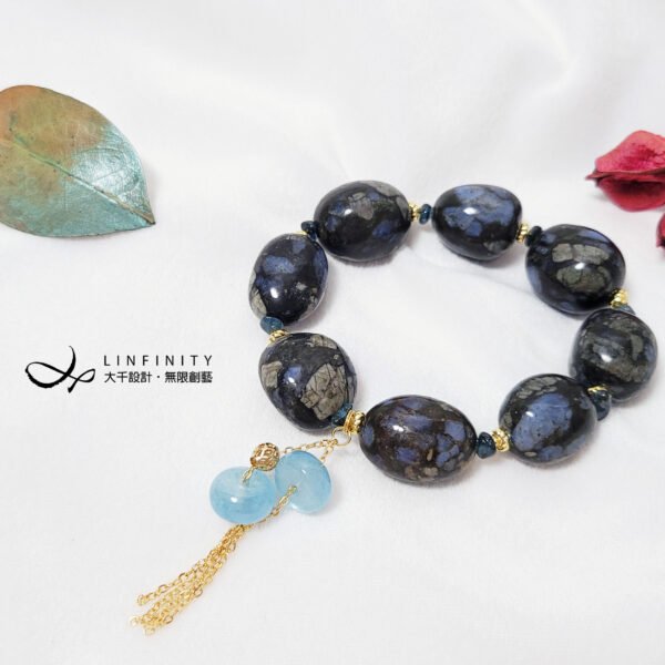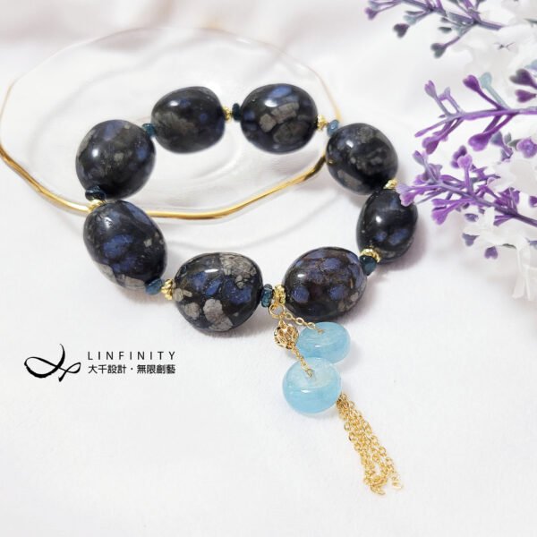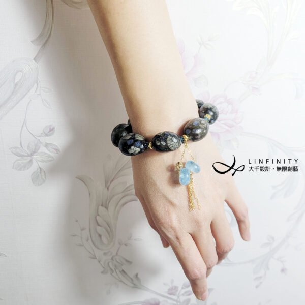鍊身飾以藍碧璽,主飾2只海藍寶古錢串飾,有招財富貴、好事成雙之美意,並藍碧璽與海藍寶色濃、淨體、閃現星光,與鋰鈹石的藍相互掩映,藍得很迷人,風情獨具。