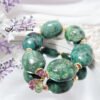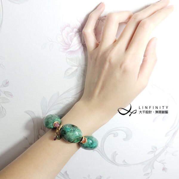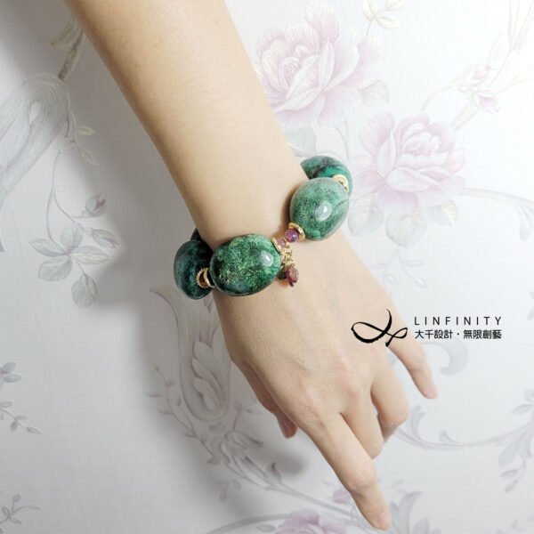 松石為體材碩大之滾石,因體材大,能見天然鐵線分佈寫意且優美,並蘋果綠、正綠、墨綠、天藍等舒心藍綠色調,看似蒼松山林,也似山水墨蹟,每一顆松石宛如畫布,紀載宛若山水畫的紋理。