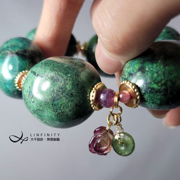 點綴以西瓜碧璽平安扣(古錢)飾、花(富貴)飾,紅、綠掩映,富貴大器、福氣典雅,華麗演繹出古董級寶石的能量與美麗紋理。