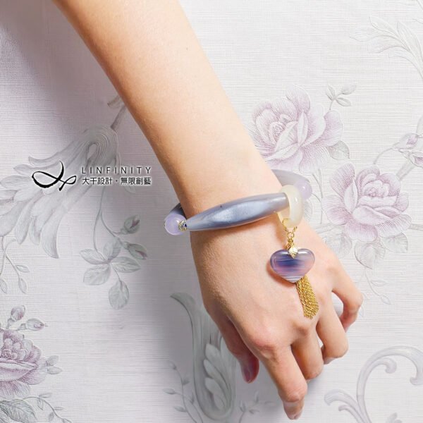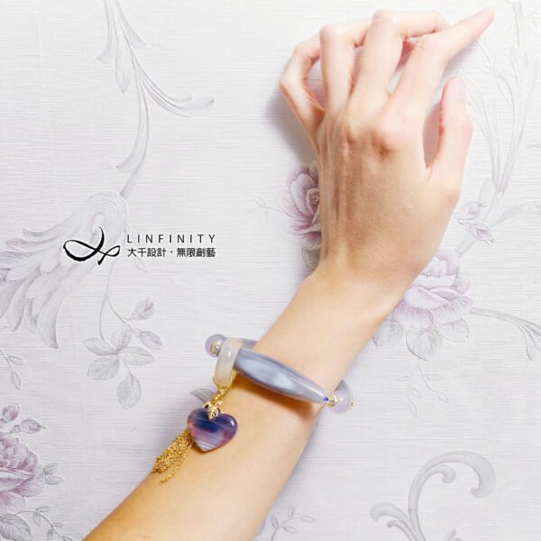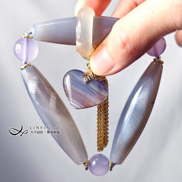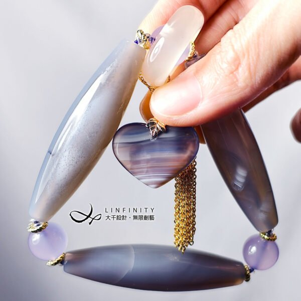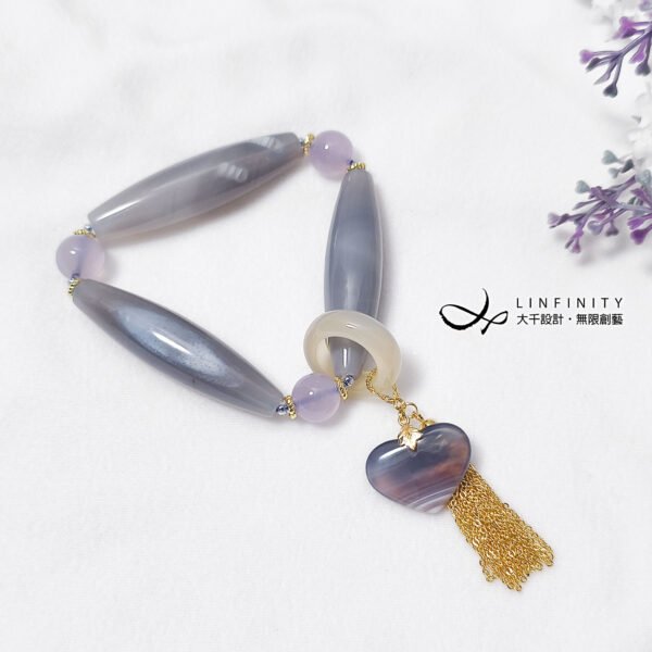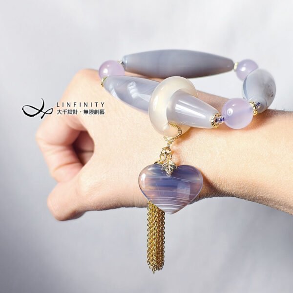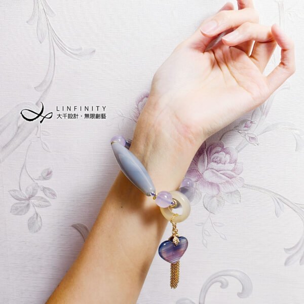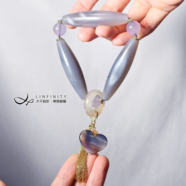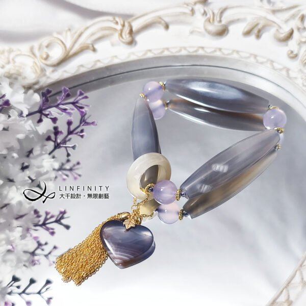 呼應煙灰紫瑪瑙的色彩,以紫玉瓍珠妝點於古董長珠間,並以冰黃瑪瑙戒(一元復始、萬象更新)佐藍紫纏絲瑪瑙心(心想事成、一葉成功)、金流蘇編製主墜。