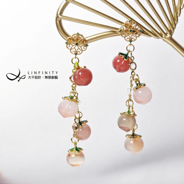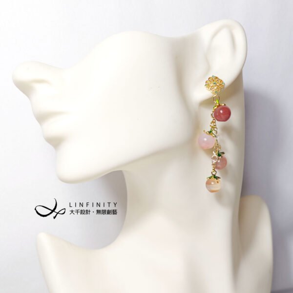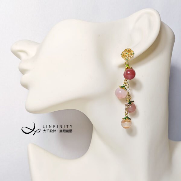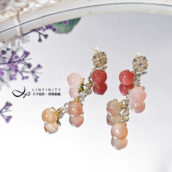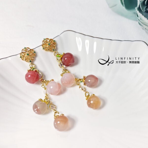 尺寸:瑪瑙桃寬約9.6mm,整體含窗花耳針高約6.7cm,可改夾式,但窗花耳針必須改變,並寶石量大、重量重,務請夾緊呦^^。
