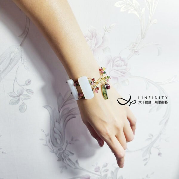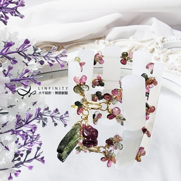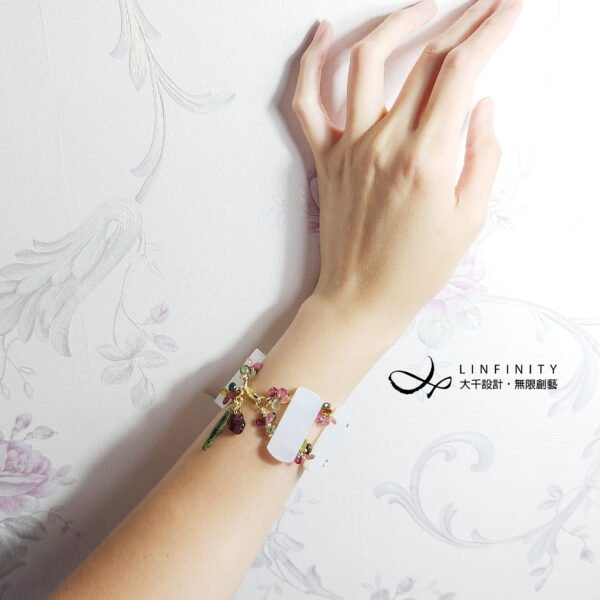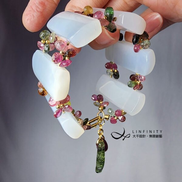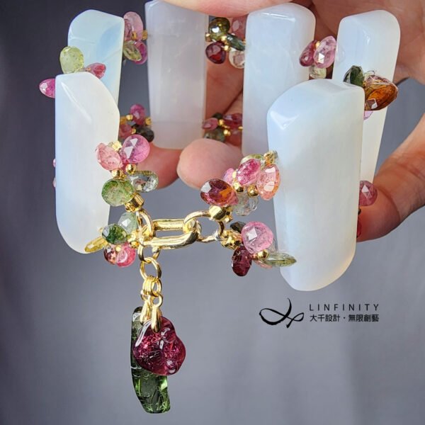 鍊身以彩虹碧璽鑽面水滴精工編製,碧璽件件色彩明亮、火彩明豔,宛若花朵開在白蛋白石間,時尚美麗。