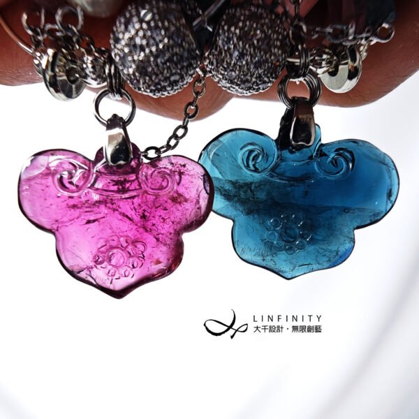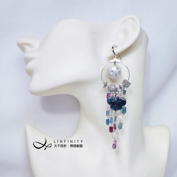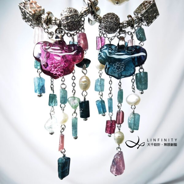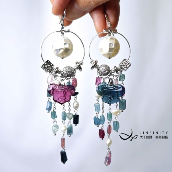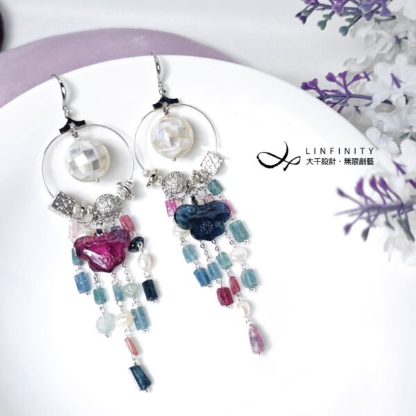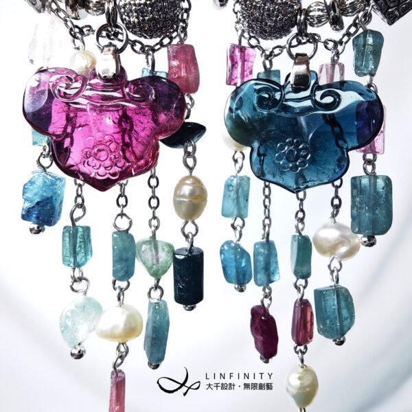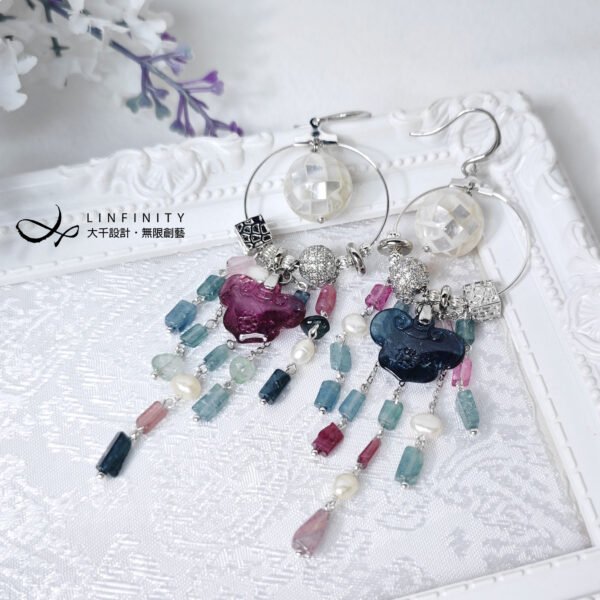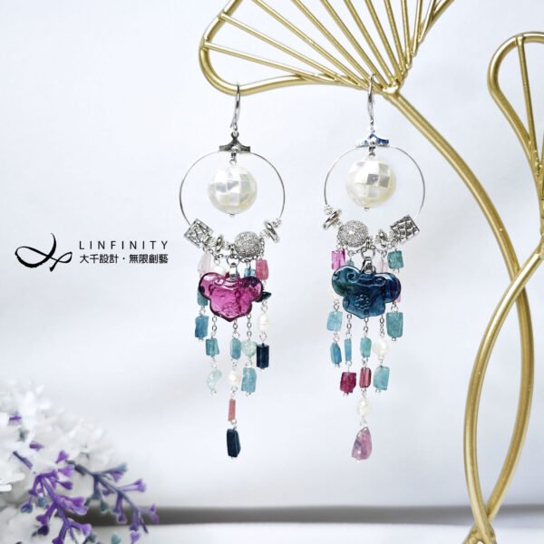 設計師嚴選紅色、藍色、藍西瓜色碧璽設計,以如意(如人所意)為主角,碧璽原礦、珍珠編華美流蘇,寶石顆顆色彩清雅、冰潤勻淨、火彩閃耀,襯以螺鈿更顯富貴,不對稱設計靈動韻律,整體古典優美、時尚亮麗、美艷動人。