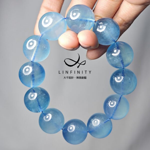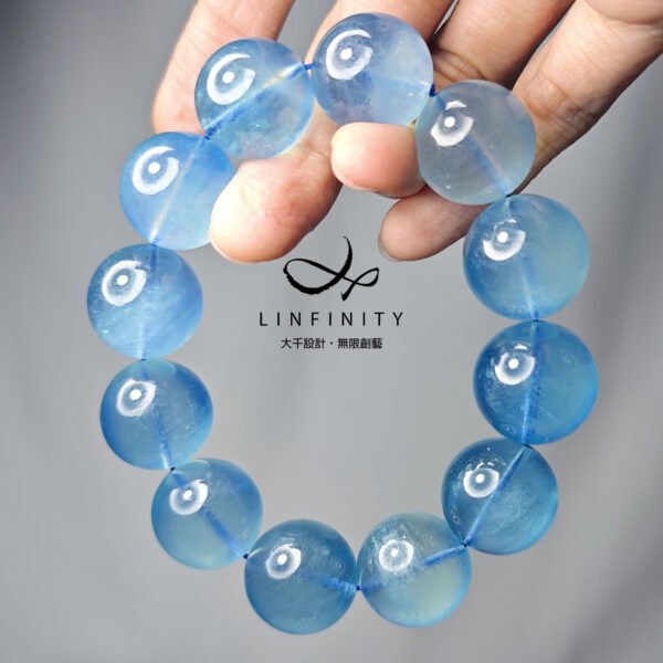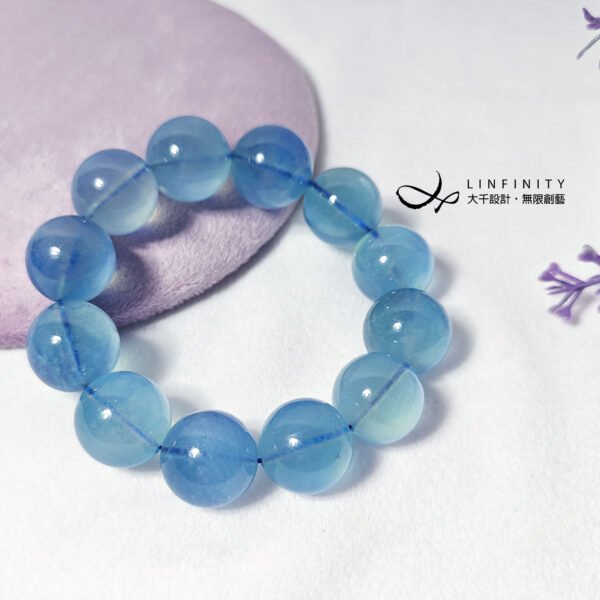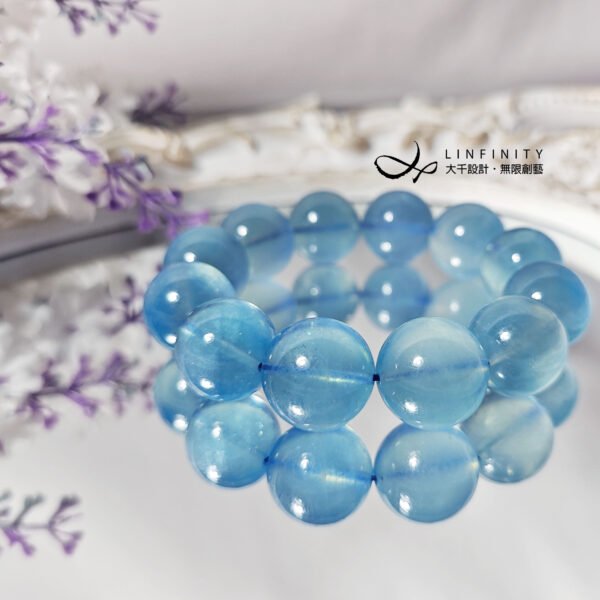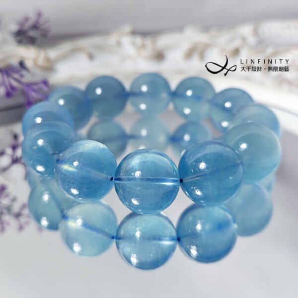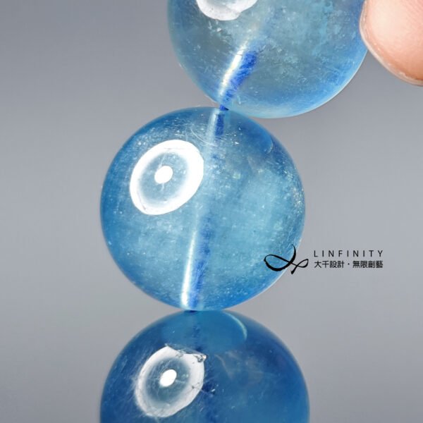 設計師嚴選勇敢者之石-海藍寶,磨製19mm體碩圓珠,寶石件件透水冰潤,藍得有層次,藍、綠掩映,帶深邃魔鬼藍色調,閃現星光、彩虹光暈,霸氣美麗,值得珍藏。