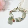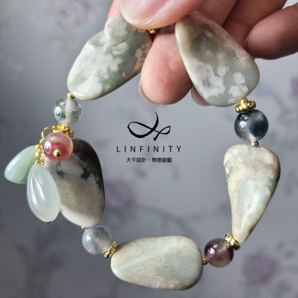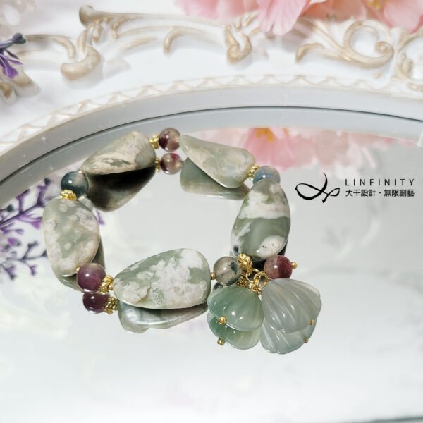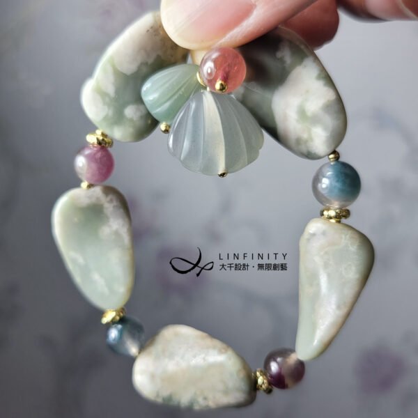 嚴選產量珍稀綠櫻花瑪瑙,精工磨製花瓣曲面形珠飾,佐飄花碧璽珠飾、鹽源瑪瑙設計。