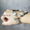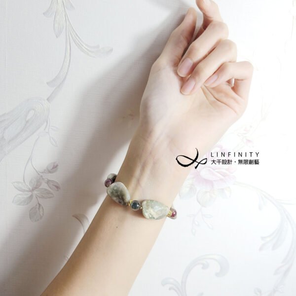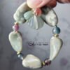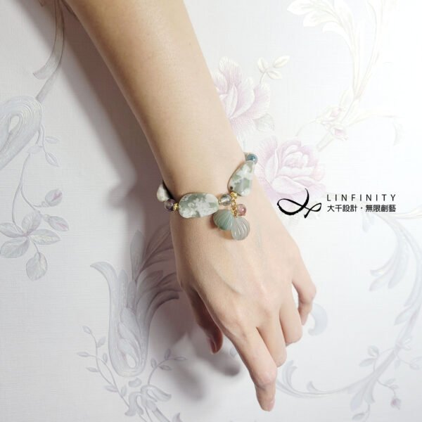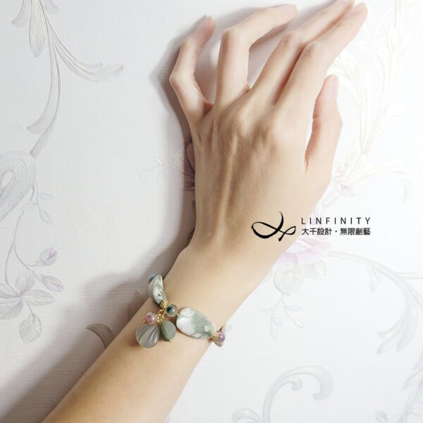 綠櫻花瑪瑙上櫻花分佈優美,色調古樸寫意,與飄花碧璽相互掩映,點綴鹽源瑪瑙貝飾,花瓣形曲面珠飾上手宛如花朵在手腕上盛開,曖曖內含光,溫潤雍容優雅,古典風情滿溢^^