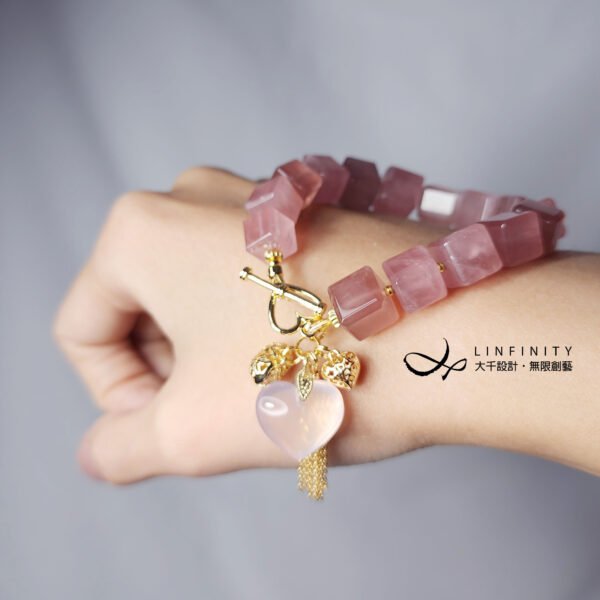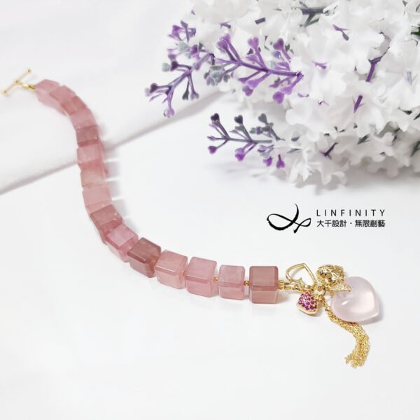 主墜星粉心(心想事成)飽滿大器、清透放光,為六芒星品種,品相完美上乘,點綴粉鑽心、金心、金流蘇飾,鍊身OT釦亦為心型,浪漫滿分,滿溢著時尚美麗的戀愛風情,並有富貴、好人緣之意^^。