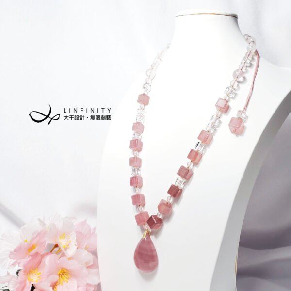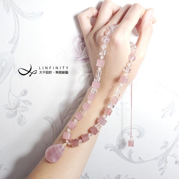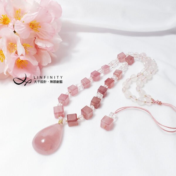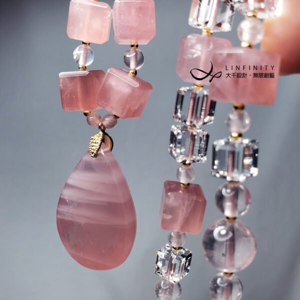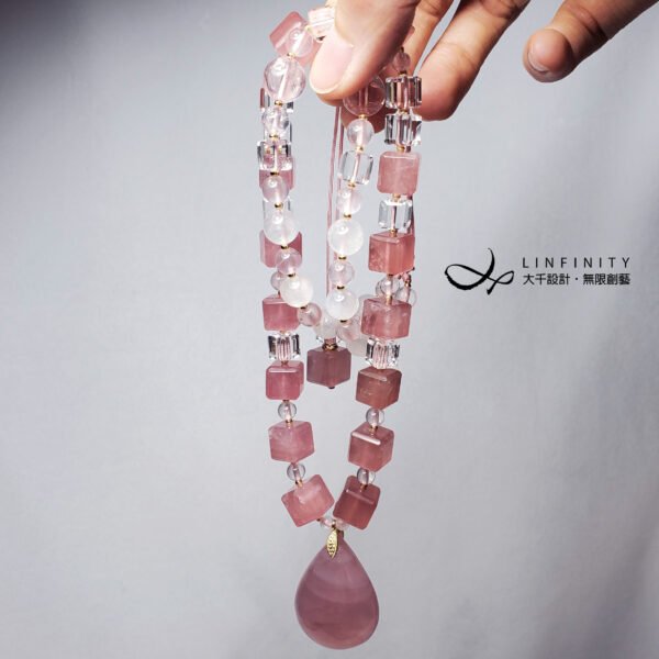 本件嚴選稀有酒紅色馬粉,精工磨製大器水滴墜、方形珠飾(天圓地方、賢良方正),巧思以星光粉晶(美好人緣)、全美白水晶(勇氣)、藍月光石(靈性智慧)共譜靈動、優雅、氣質鍊身,寶石冰潤無瑕、色彩內斂、閃耀,主墜水滴更是酒紅色、水紋、星光效應等美麗紋理兼具,是為甜美、知性、滿溢女性風情的夢幻逸品。