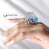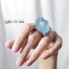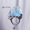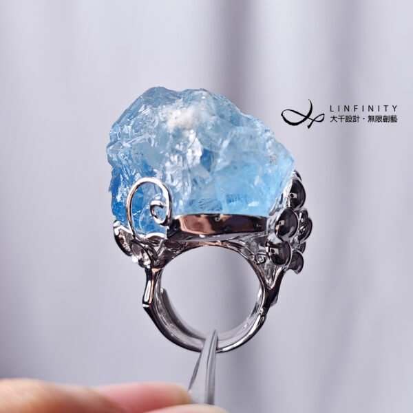 呼應藍螢石的雪山風貌,戒台精工拉海浪、祥雲型紋,鑲製立體、鏤空華美戒台(純銀鍍白K金)、點綴白鋯石擬紛飛的雪花冰晶,戒面下(開窗)可見本件藍螢石之高透光感。