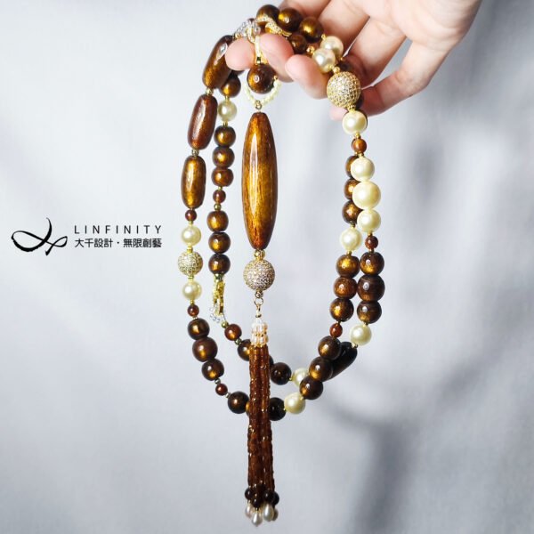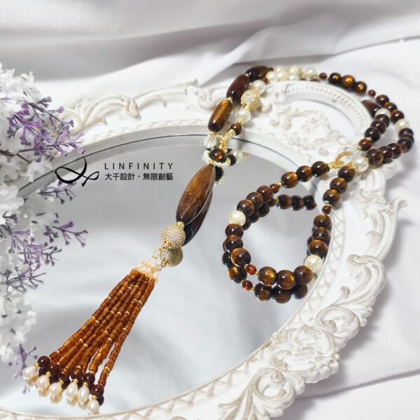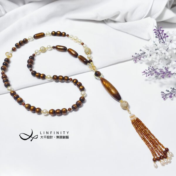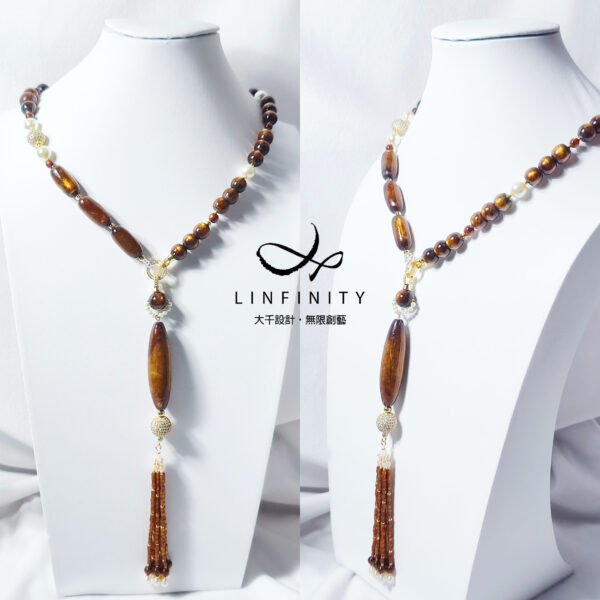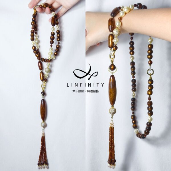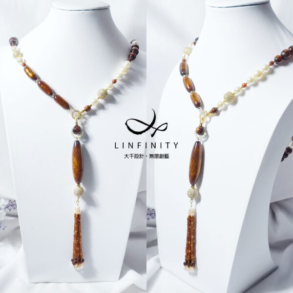 鍊身佐黃金貝珠、黃K金鑽配件設計,不對稱設計盡顯韻律華美,可自行拆裝為長、短2用項鍊。