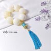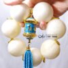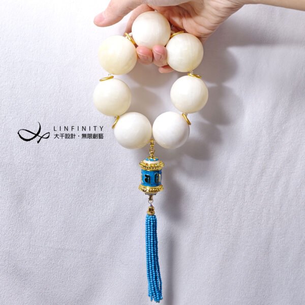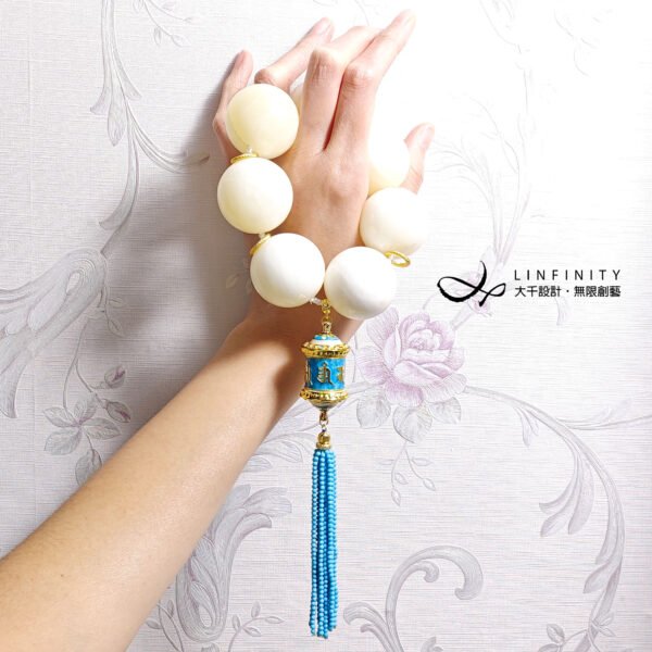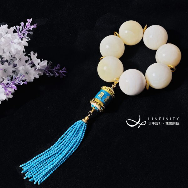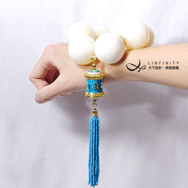 呼應主石黃金硨磲的溫潤色調,主墜以天空藍六字真言轉經輪琺瑯佐琉璃流蘇設計。轉經輪琺瑯精美,軸承順滑度極高(轉動極順),極富把玩樂趣。