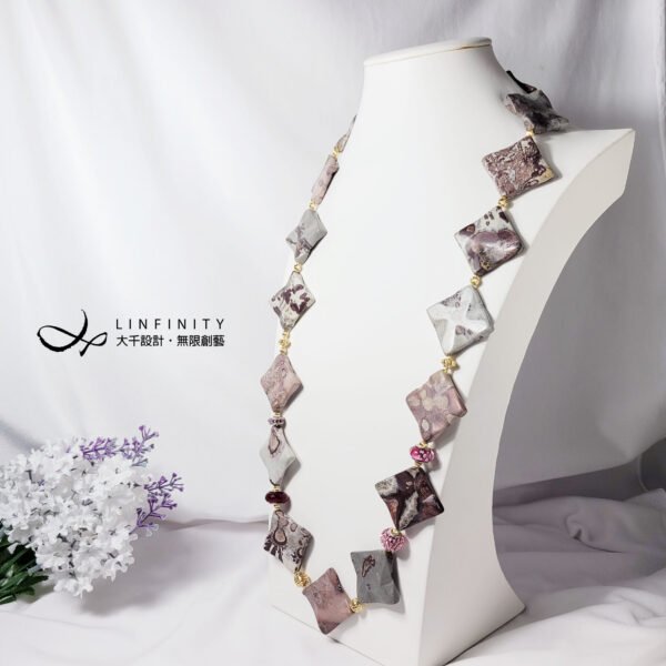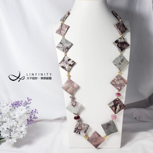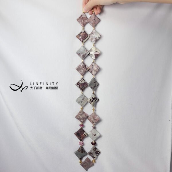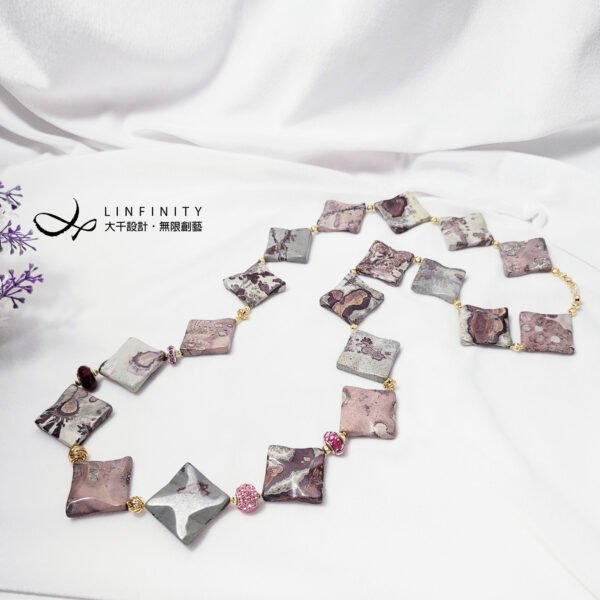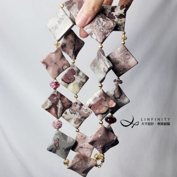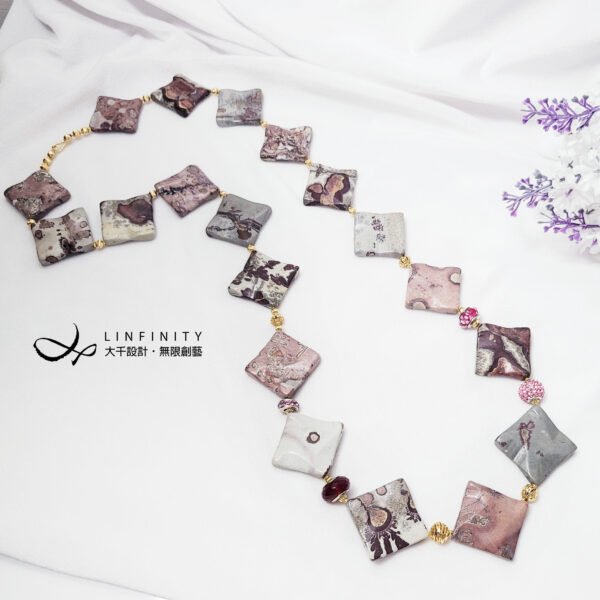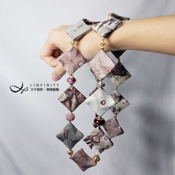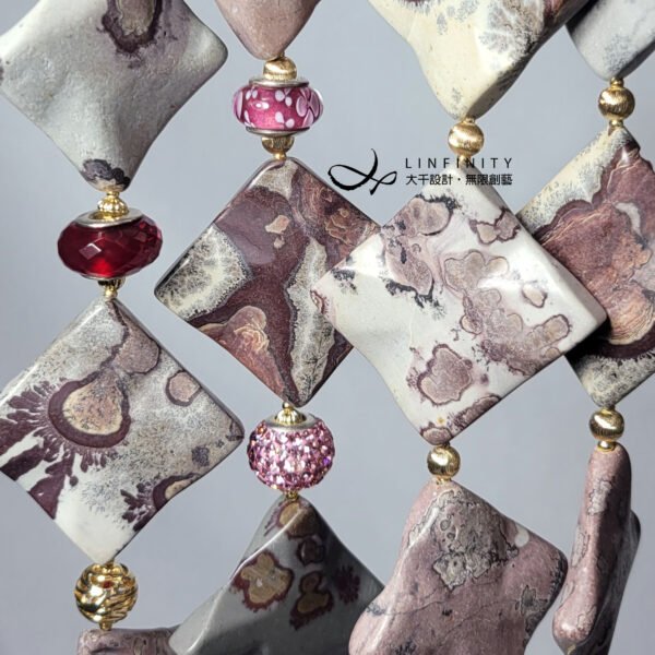 嚴選稀有豹斑石,手工磨製體材碩大、方形曲面片飾,件件能見莫蘭迪色調紅、粉、白、黑、灰等色豹斑紋、油畫感等多種紋理,片片宛若造物主的畫作,巧奪天工。