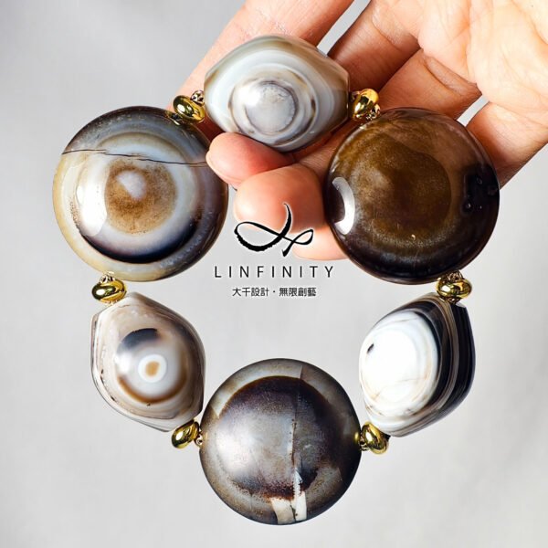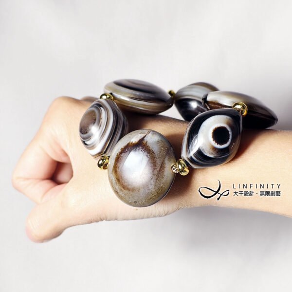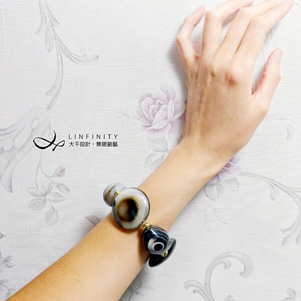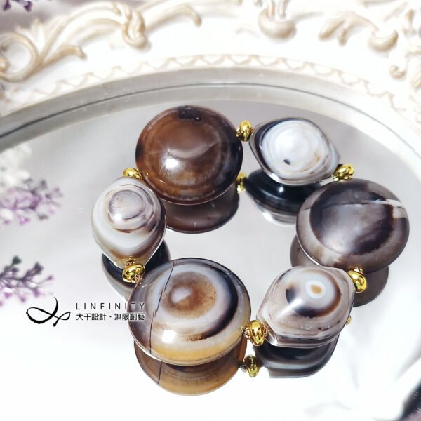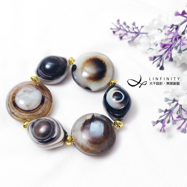 設計師嚴選象徵靈性、富貴的古董寶石-纏絲瑪瑙,精工磨製大器圓潤眼型、扁圓形珠飾,寶石顆顆雙天眼,寶石體材相當大(30mm、38mm),纏斯紋理獨具,上手大器非凡,為助事業、開智慧、具領袖風範之逸品,極其難得,深具收藏價值。