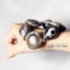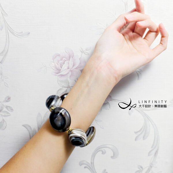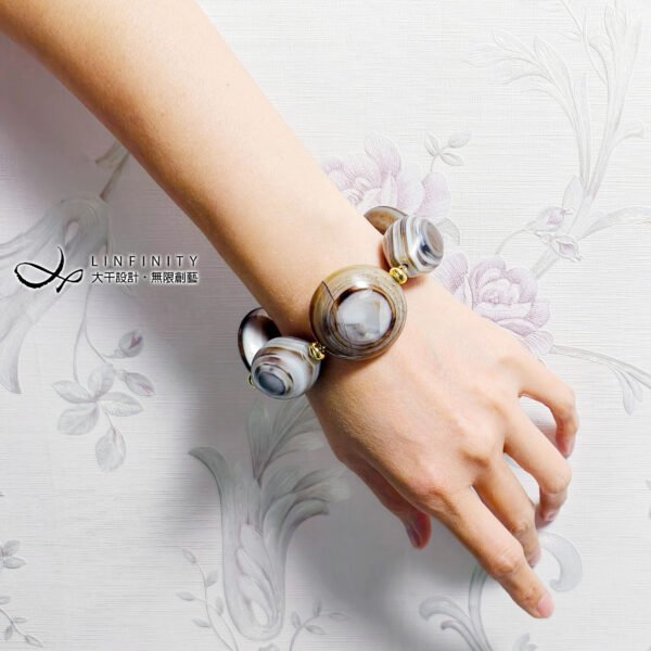1.圖上瑪瑙眼型珠長30mm、寬25mm,圓扁珠直徑約37mm、厚約17mm,因珠型大,手圍16.5-18cm皆宜。