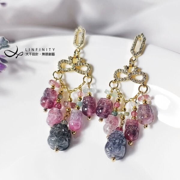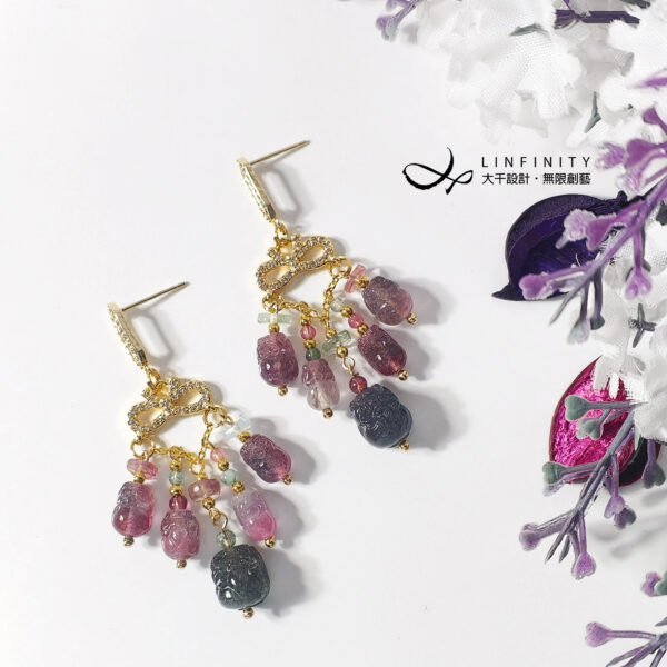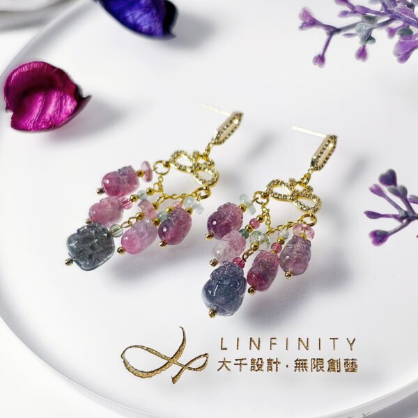 巧思以龍葵紫(紫灰色)碧璽豼貅,為整體紅、紫、藍交織的色彩關係注入低彩度的莫蘭迪美學,使作品在華麗之中更顯內斂、沉穩與優雅。