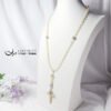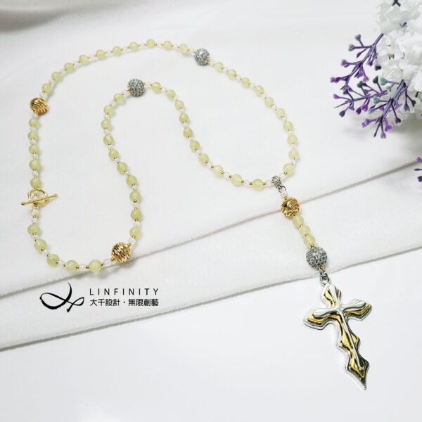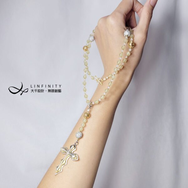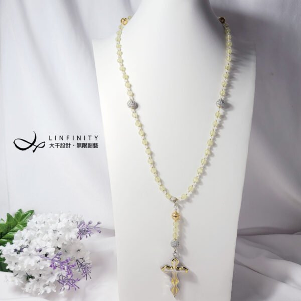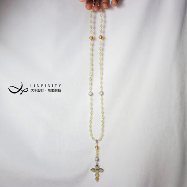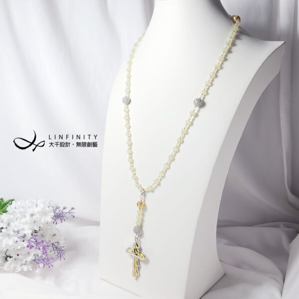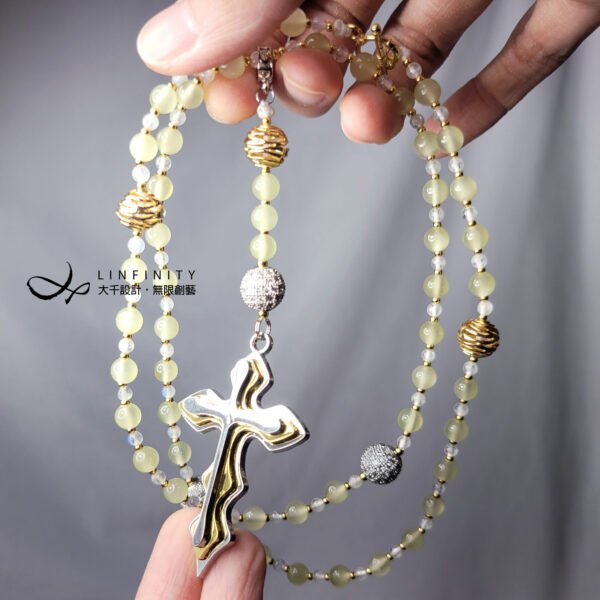 藍月光石淨體無斑、閃現高藍光,並佐以閃耀鑽球、K金球,主飾金色鈦鋼十字架,整體溫潤之餘、閃耀亮眼,風雅時尚,亮眼迷人。