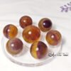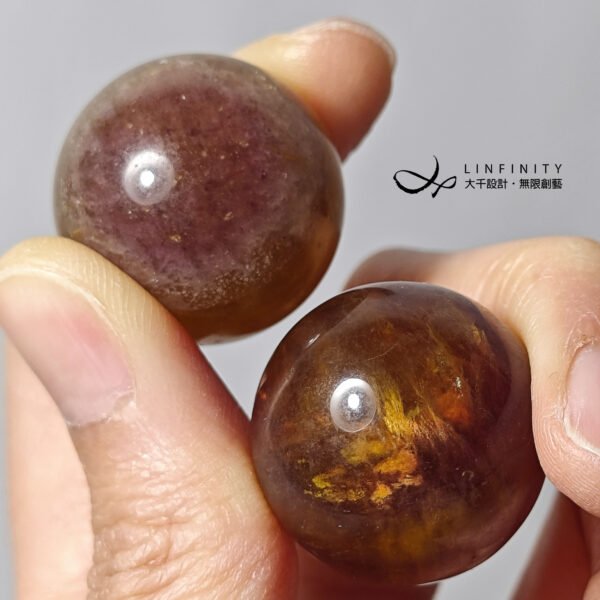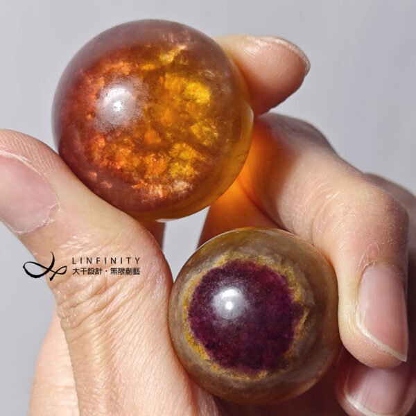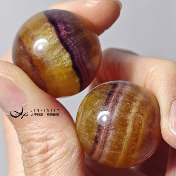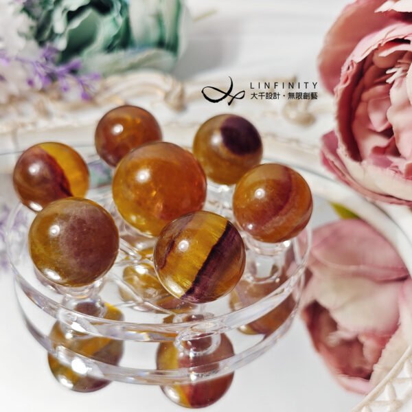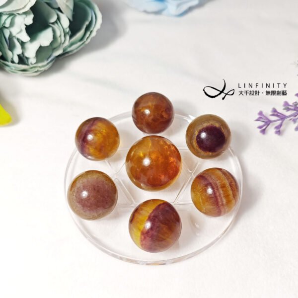 每一枚球皆是萬中選一,寶石晶體透、水光美,橙、黃、紫、紅相間,紋理獨具,其中一枚螢石球紋理帶紅色眼紋(靈性第三眼、智慧、紅運當頭),難得可貴,品相極美。