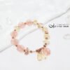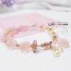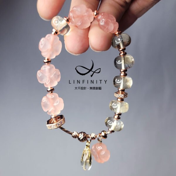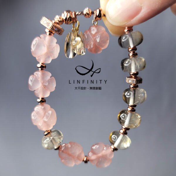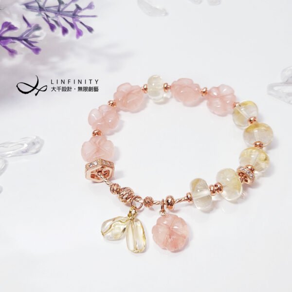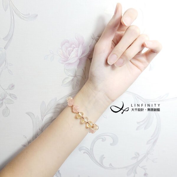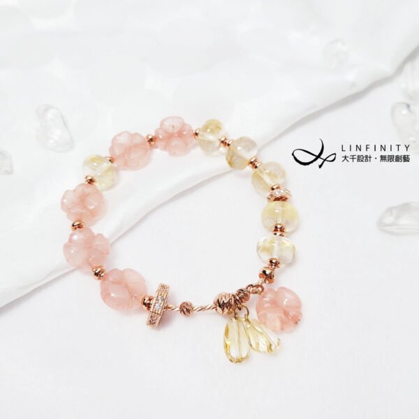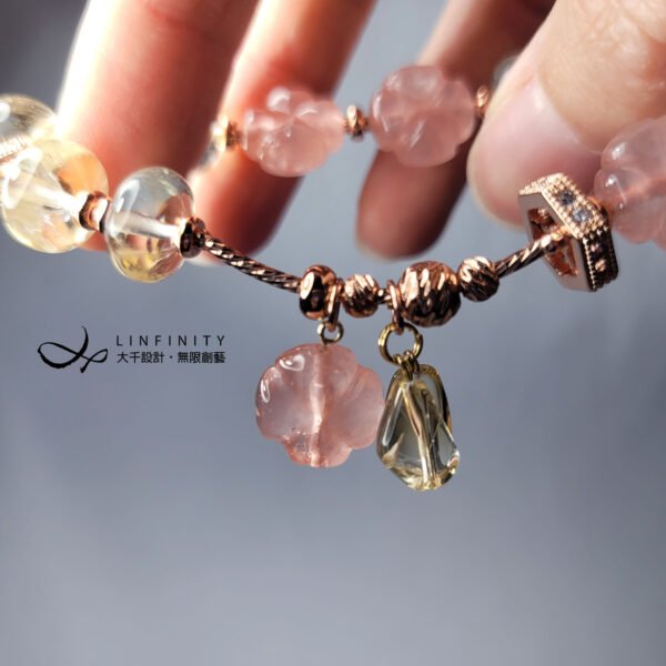 嚴選愛情之石-粉晶,精工磨製幸運草珠飾,相佐財富之石-黃水晶、閃耀玫瑰金飾物設計。