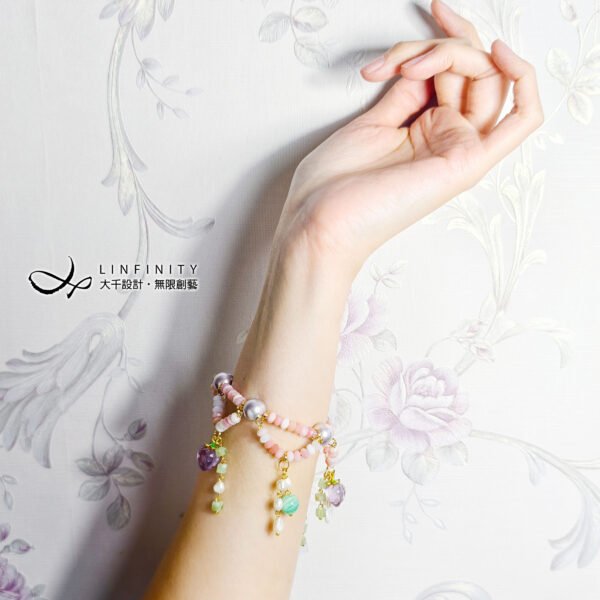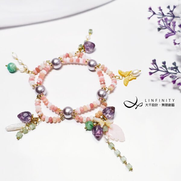 粉紅蛋白 紫黃晶 珍珠母貝 綠紋石 岫玉 春意盎然 手鍊 單品 禮物