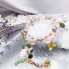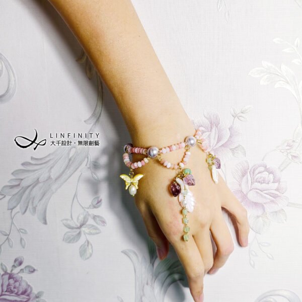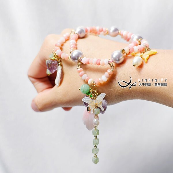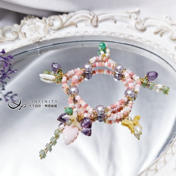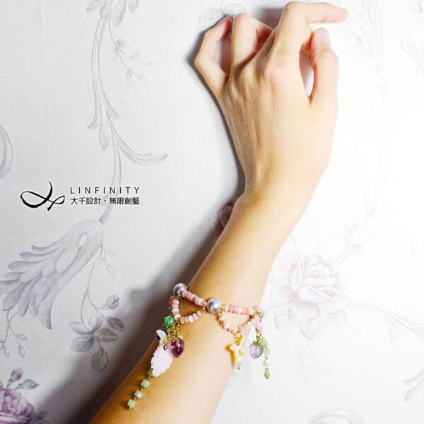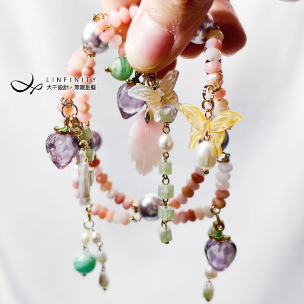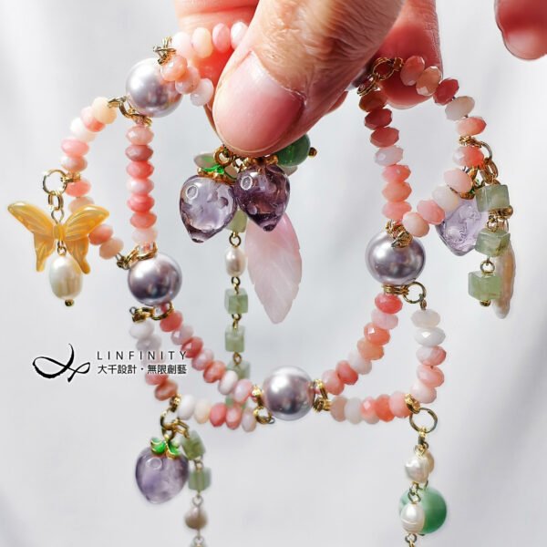 鍊身5處,設計粉蛋白葉(一葉成功)、紫黃晶草莓(美好)、母貝蝴蝶(福氣)、紫貝珠、綠紋石、珍珠、岫玉等多寶墜飾,象徵所願皆成,並寶石件件色彩溫潤柔美,整體春意盎然,浪漫富貴。