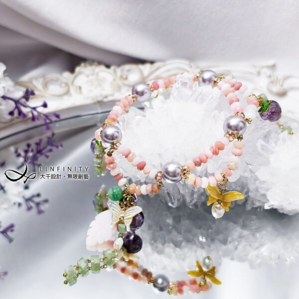 材質:天然粉紅蛋白石(澳寶、歐泊)、紫黃晶、貝珠、珍珠、母貝、綠紋石、岫玉、925銀、18K金