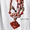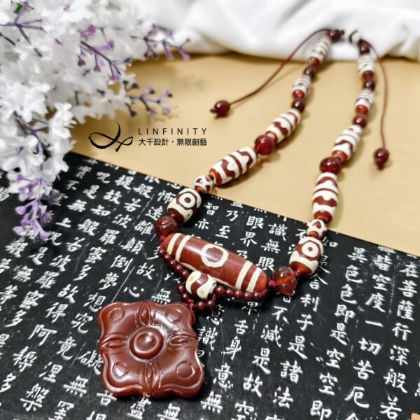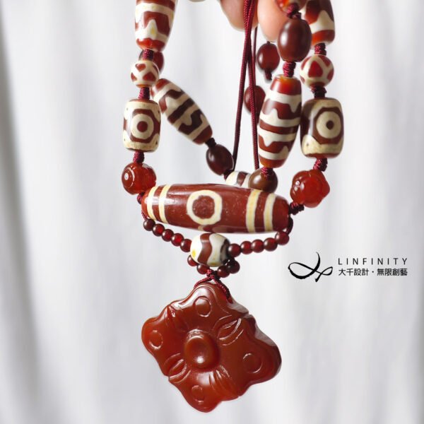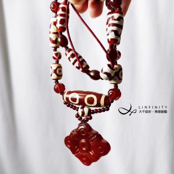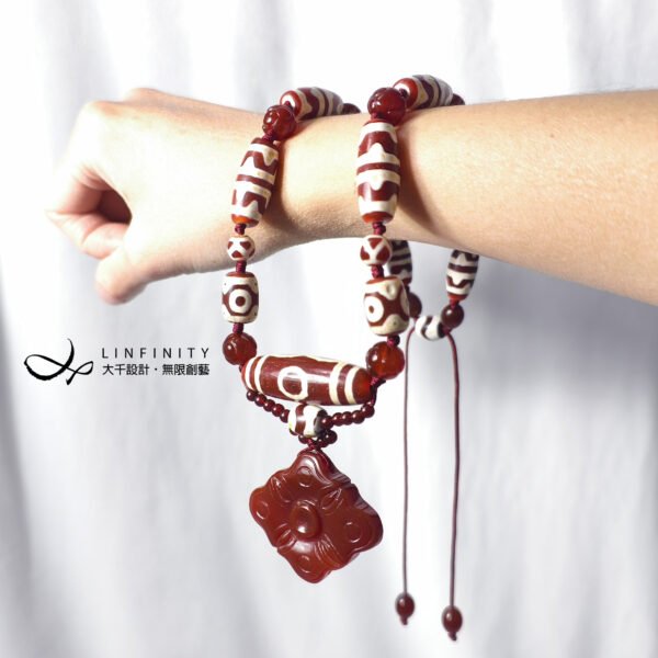鍊身以「二眼」(雙眼)天珠、「虎牙」天珠、蓮花珠型瑪瑙設計,寓意穩定心神、移災去邪、智慧招財,增添整體吉祥力量。