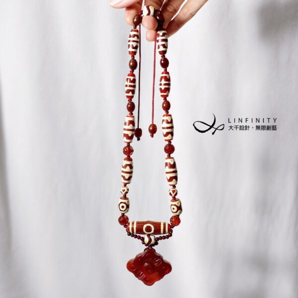 全鍊遵循古法,以繩線編製,一線到底,象徵天珠的剛毅果決、富貴綿延。