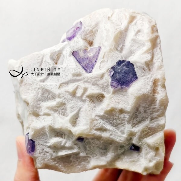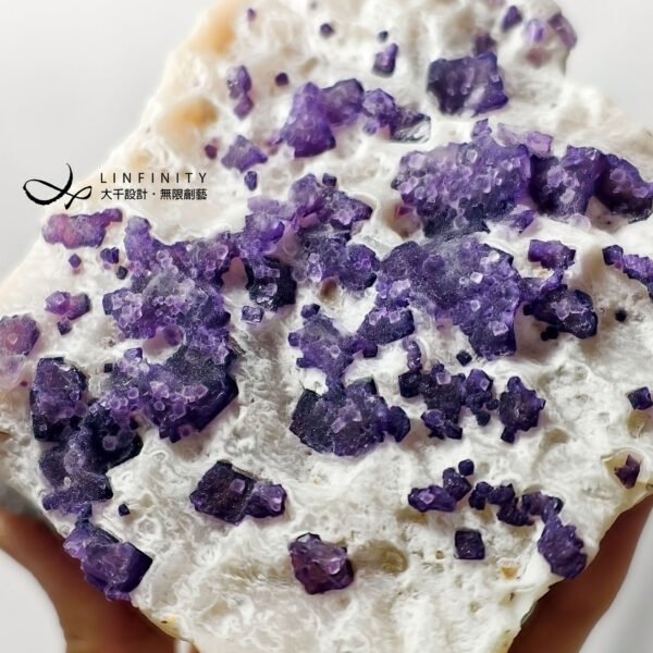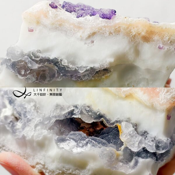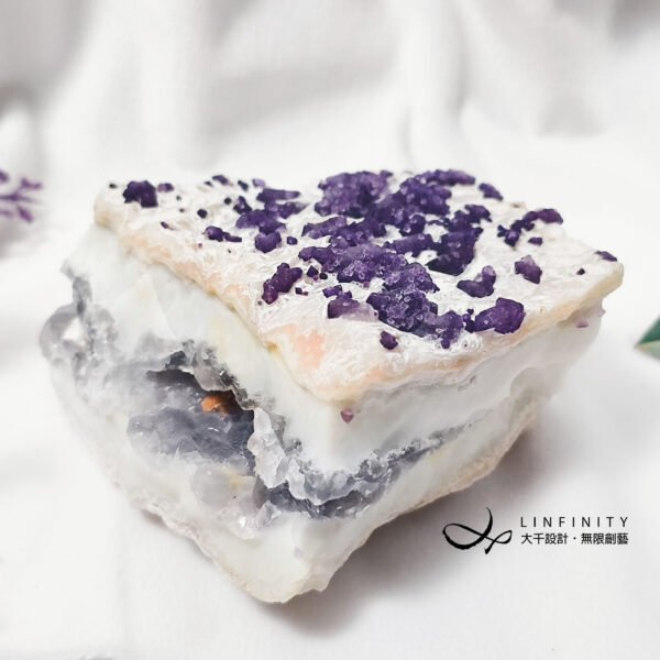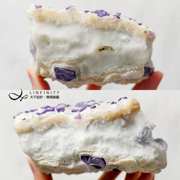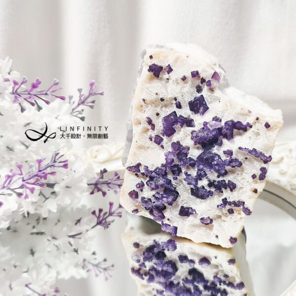 擺件正面白石英母岩略帶稀有粉色調,其上正紫色螢石晶體沿著母岩點點分佈、此起彼落,整體礦型與色彩白、粉、紫、銀灰色涇渭分明,意境抽象前衛、夢幻美麗,巧奪天工,宛若大地之母的雕刻作品,千年一遇,值得收藏。