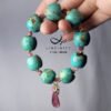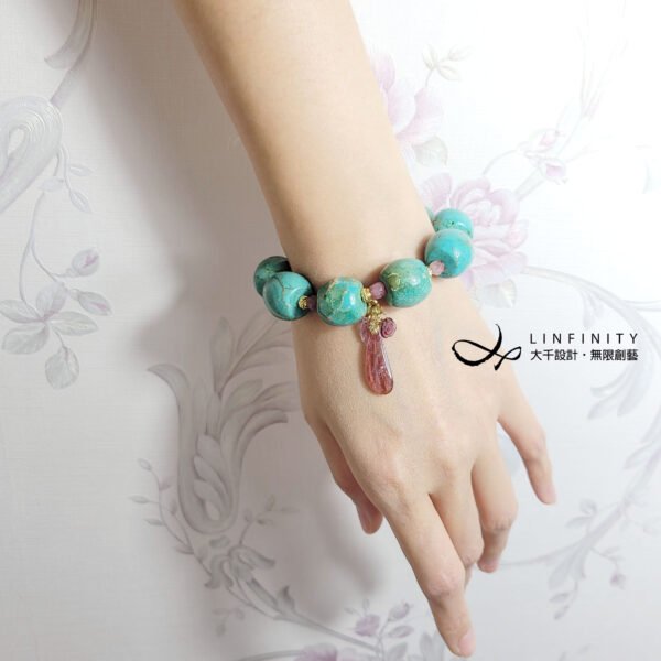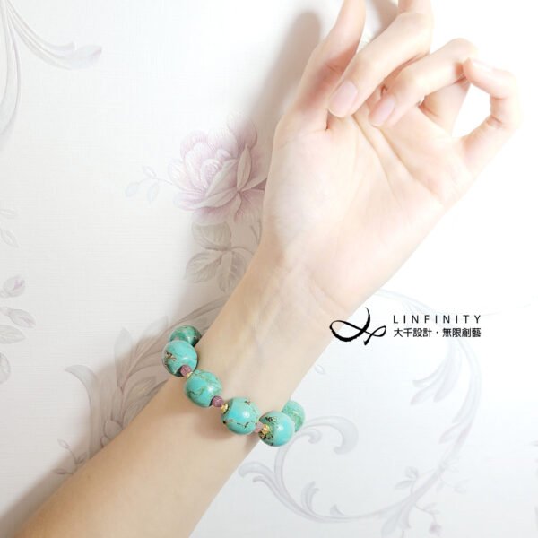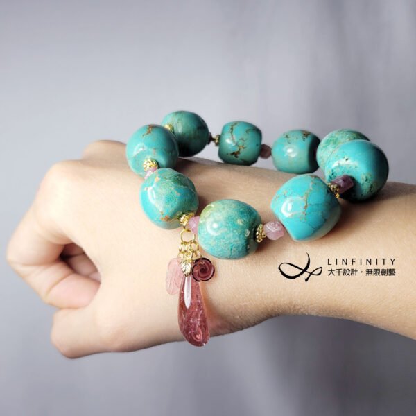 1.圖上松石鼓珠寬約17.5mm、厚15.2mm,碧璽水滴長約26mm,整體手圍約16cm。