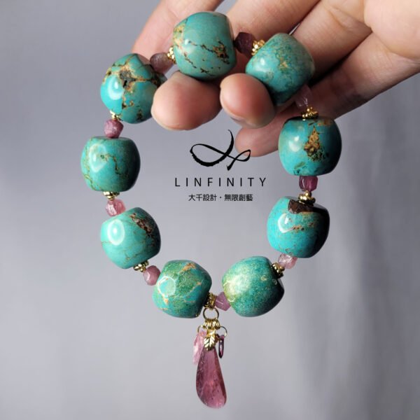 嚴選古董寶石-松石(土耳其石),相佐古董寶石-碧璽(電氣石),華麗演繹出亙久寶石的能量與美麗紋理。