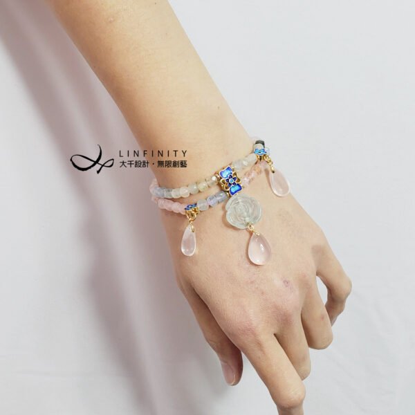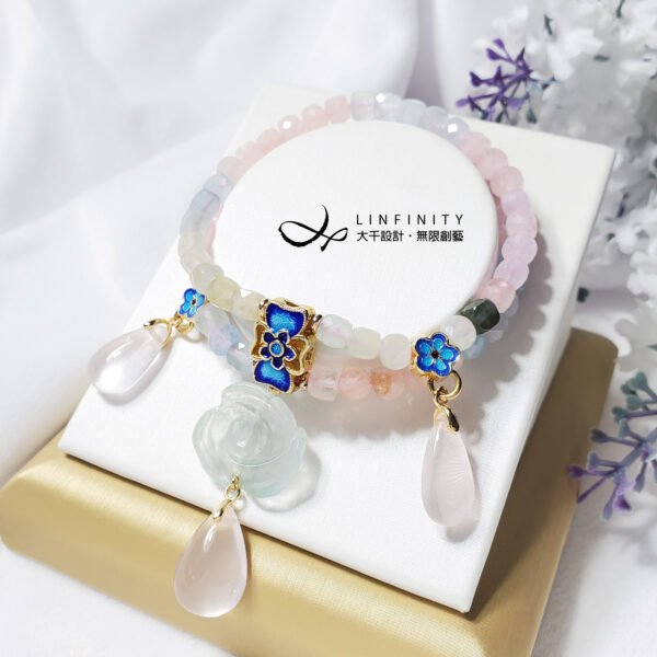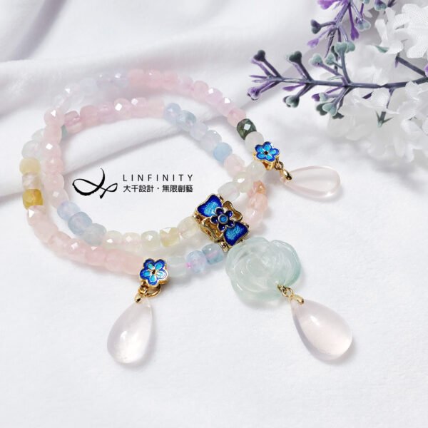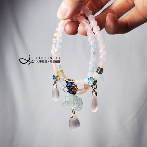 材質:天然綠柱石(海藍寶、摩根石)、葡萄石、粉晶、琺瑯、18K金、925銀
