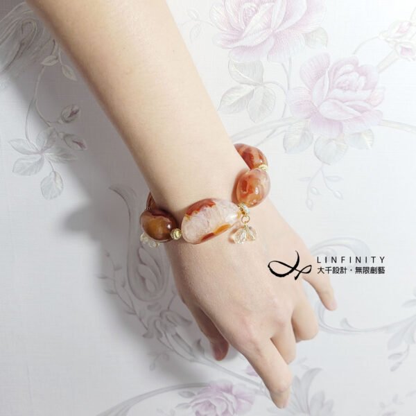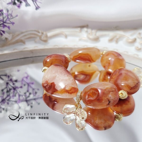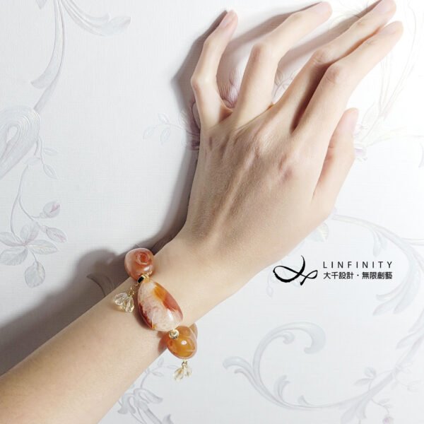 設計師歷時、費心、淘選冰種橘紅瑪瑙(玉瓍),件件可見白、橘、紅紋理,或纏絲狀、或花狀,更有微型、稀有聚寶盆,可愛討喜,洋溢獨一無二的美麗。