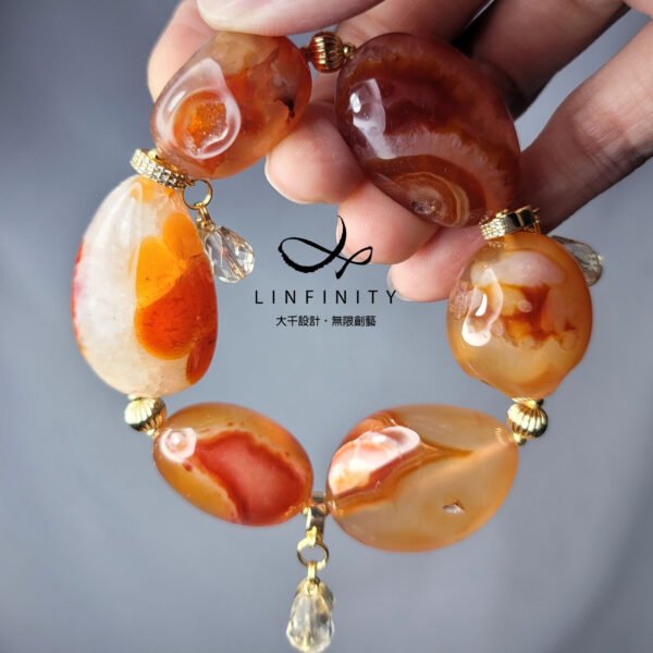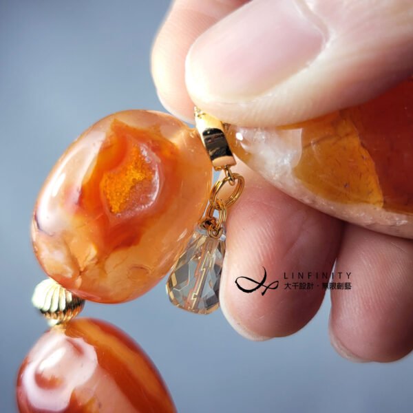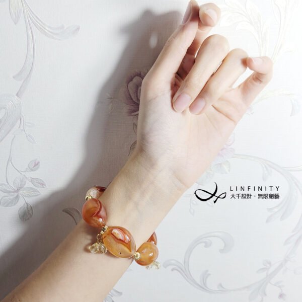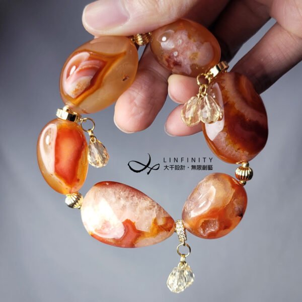 鍊身襯黃水晶鑽面水滴墜飾,上手令手腕每個角度都是迷人風景,整體成色大橘大利,極顯富貴、華美、與大器,更有吉祥美好寓意。