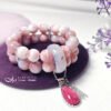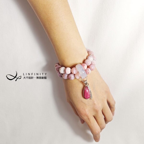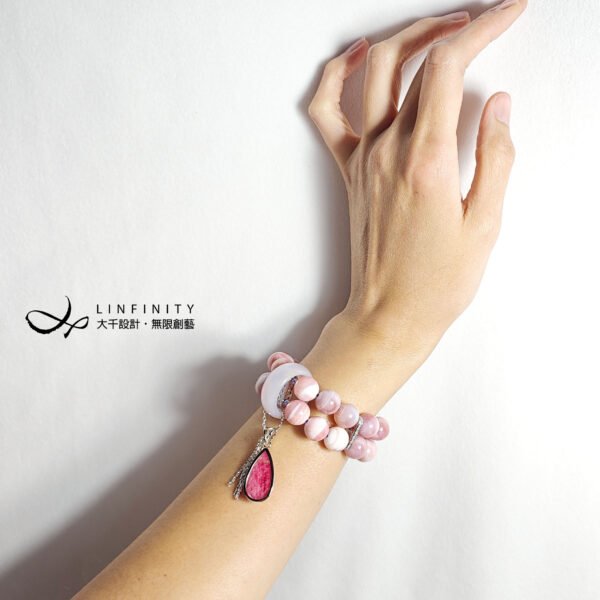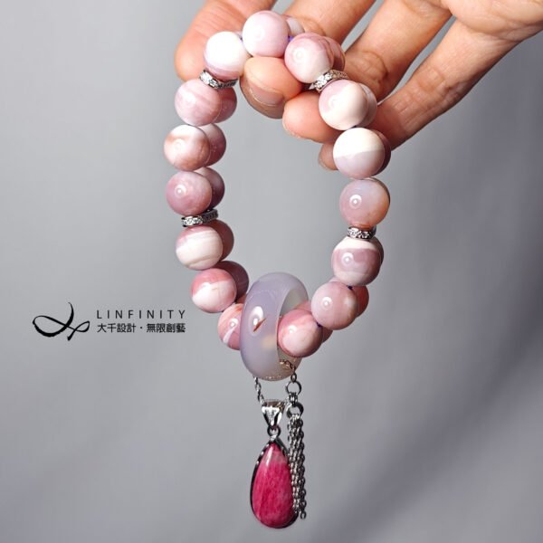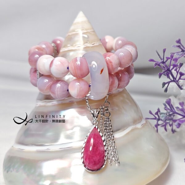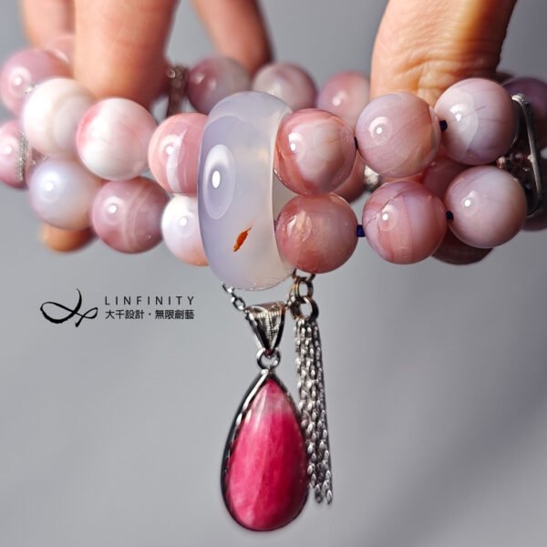 嚴選紫紅色胭脂瑪瑙(玉瓍),佐冰紫白瑪瑙、紅豔玫瑰石(薔薇輝石)設計,成為本位大紅大紫美人兒。