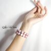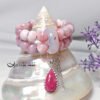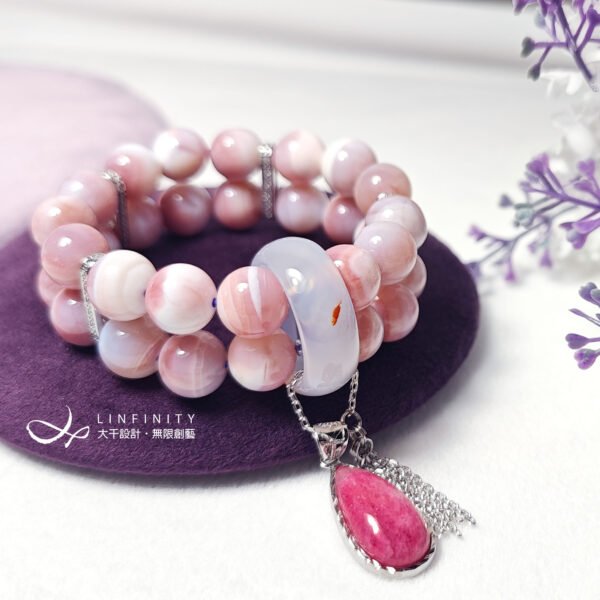 呼應胭脂瑪瑙的白、粉、紫色調,以頂級冰透白紫色瑪瑙扳指(一元復始)、玫瑰石水滴設計為主墜,寶石件件色彩冰潤、恬靜、放光,十足美麗,2排鍊身設計,富貴大器、華美動人、紅運當頭。
