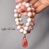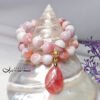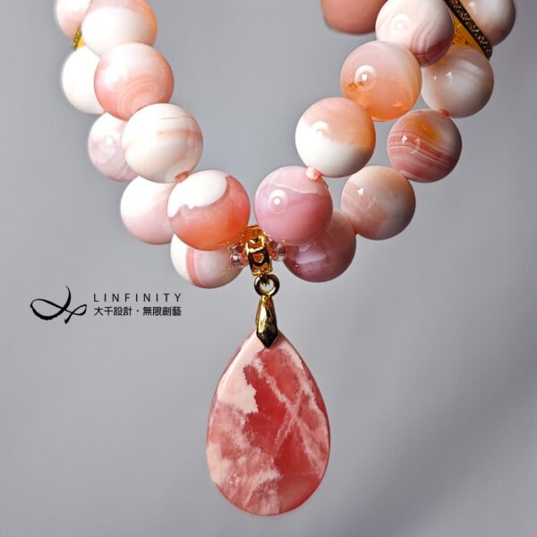 呼應胭脂瑪瑙的白、粉、橘色調,以冰種紅紋石水滴設計為主墜,寶石色彩冰潤、恬靜、放光,十足美麗,2排鍊身設計,富貴大器、華美動人、紅運當頭