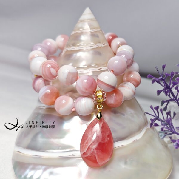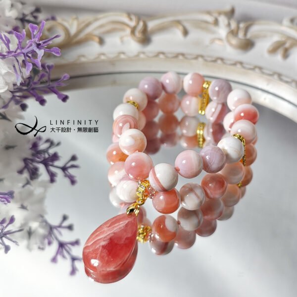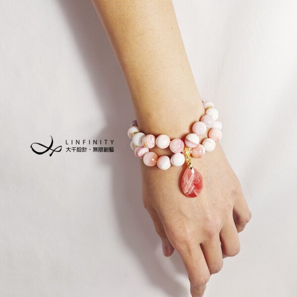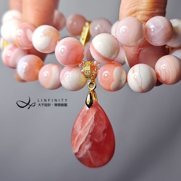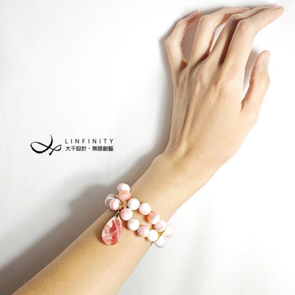 嚴選橘粉色胭脂瑪瑙(玉瓍),佐冰紅紋石(菱錳礦)設計,成為本位紅運當頭美人兒。