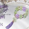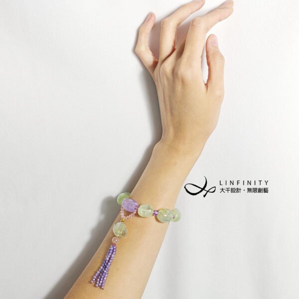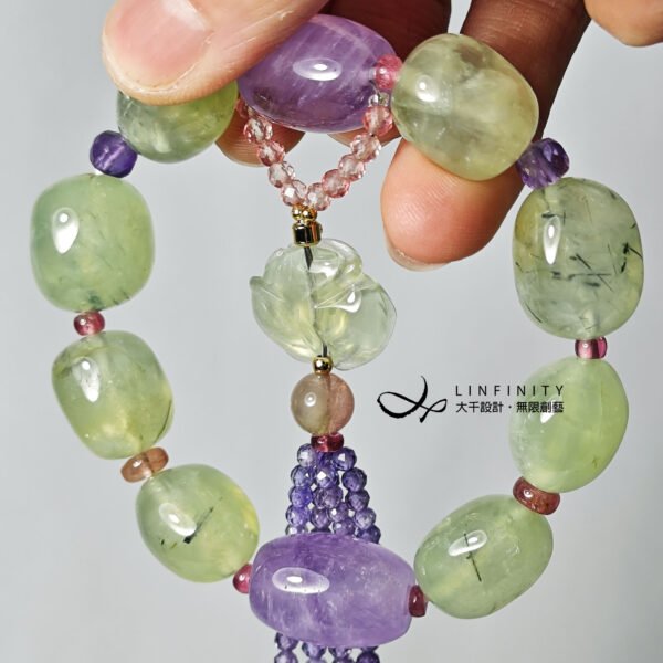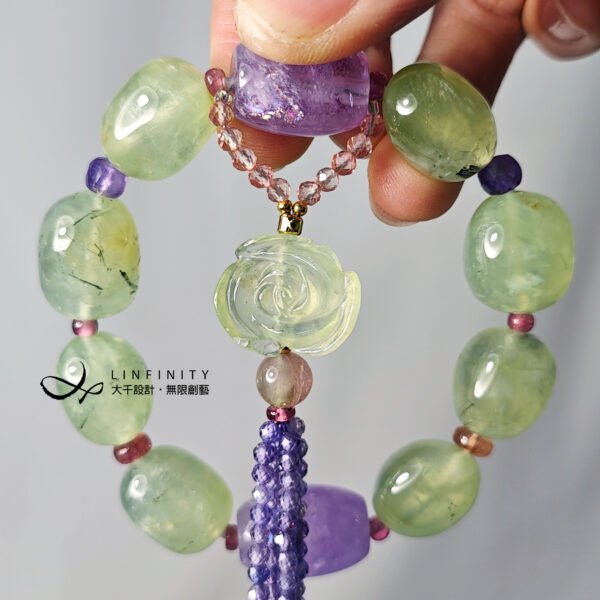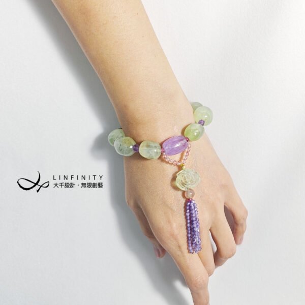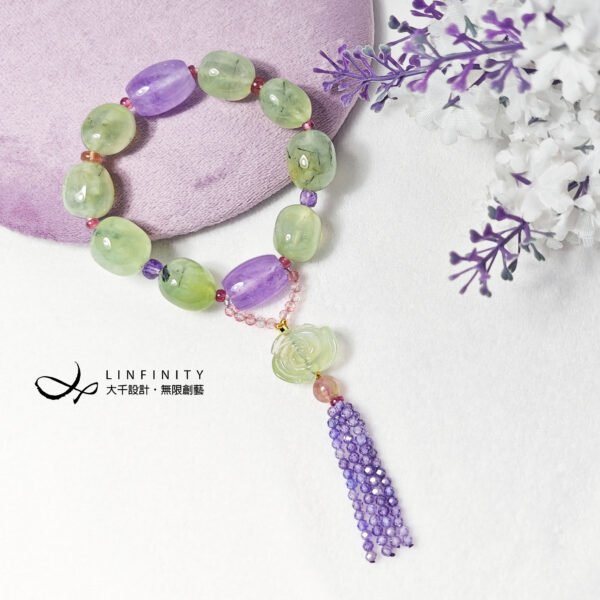 主墜為葡萄石玫瑰佐西瓜碧璽(紅綠碧璽)、紫水晶流蘇設計,晶體透澈、色調清雅,整體春意盎然,優美而富有韻律感,是為時尚美麗、馥含古典氣息之臻品。