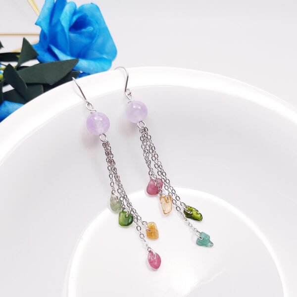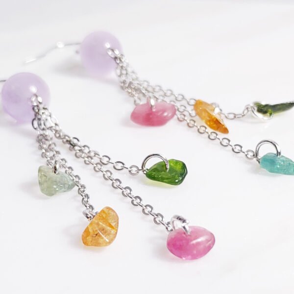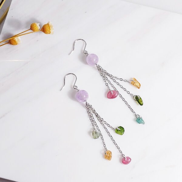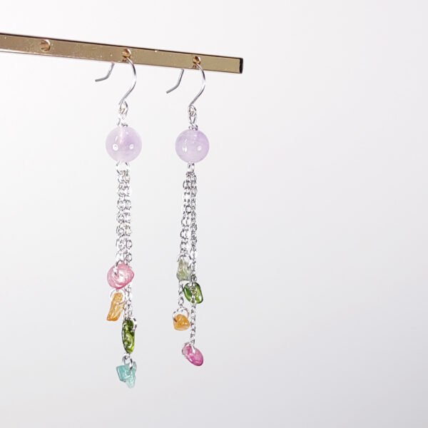 嚴選天然薰衣草紫水晶,相佐色彩艷麗豐富的碧璽,精工編製流蘇造型,寶石清澈冰潤、色彩勻淨、水光光極美,整體典雅而時尚。