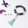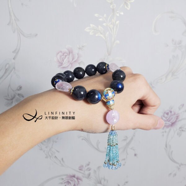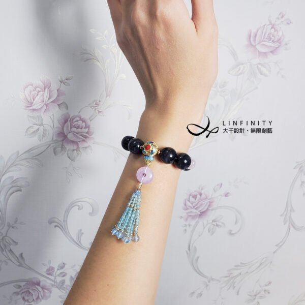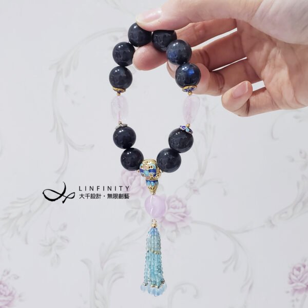 綴飾部分嚴選蝙蝠(福氣)紋飾、葫蘆(福祿)造型琺瑯,精工編製以紫鋰輝平安扣(古錢)、星光海藍寶(勇敢者之石)流蘇,極盡奢華之魅力,盡顯大器之風範。