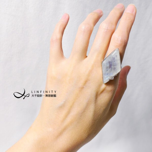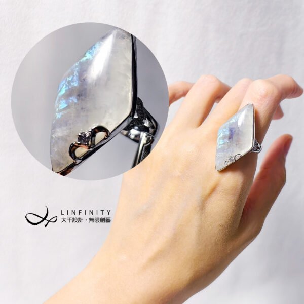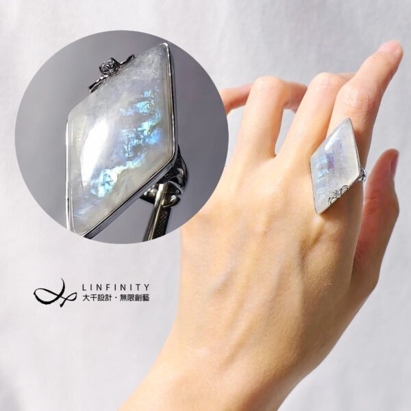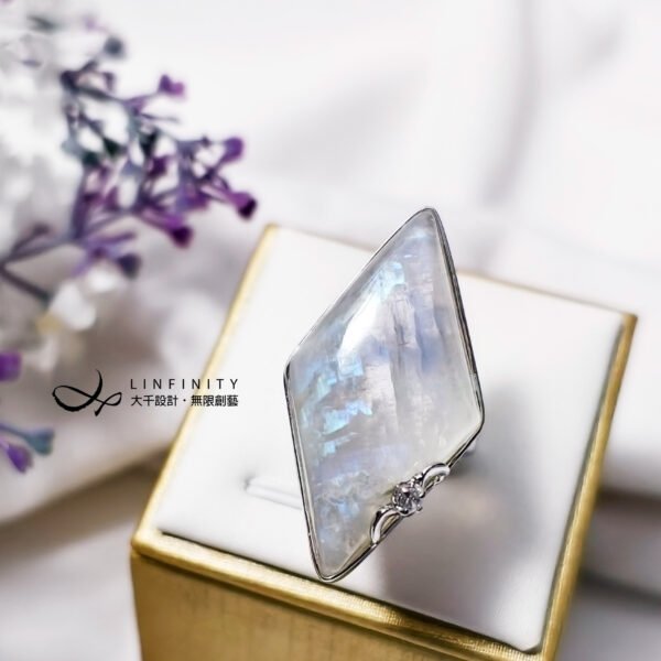 設計師嚴選高品藍月光石,磨製菱形戒面,彩虹藍光閃現,晶體透、水光美,極少黑點與礦缺,光澤表現優越上乘。